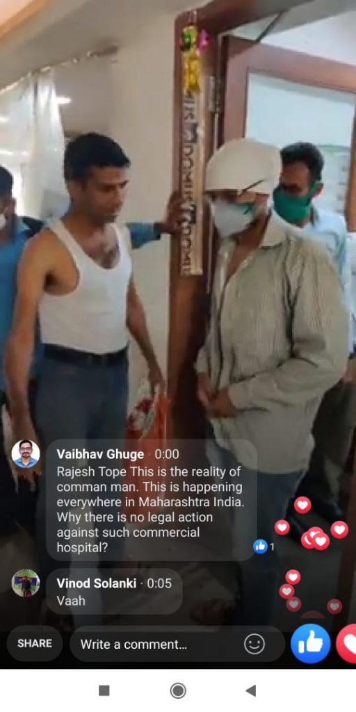नाशकात सुरू झालेल्या अनोख्या अशा ऑपरेशन हॉस्पिटल टीम ने आज एका पेशंटच्या नातेवाईकांचे वोकहार्ट हॉस्पिटल ने जास्तीचे पैश्यांचा परतावा मागच्या 4 दिवसापांसून थकवलेला असताना त्या नातेवाईकाने अनेक वेळा फोन करूनही हॉस्पिटल प्रशासनाने कोणतेही उत्तर दिले नाही आणि म्हणून पेशंट ने टीम ऑपरेशन हॉस्पिटल ला संपर्क केला असता टीम तिथे पोहोचली व पैसे न देण्याचे कारण विचारले तर हॉस्पिटल प्रशासन उडवा उडवीचे उत्तरे देत असल्याने जितेंद्र भावे यांनी कपडे काढून तिथेच ठिय्या देण्याचा निर्णय घेतला, काही वेळात पोलीस आल्याने परिस्थिती नियंत्रणात आली परंतु अजून हॉस्पिटल वर कारवाई होणार की नाही याचे स्पष्टीकरण पोलिसांकडून आलेले नाही थोडाच वेळात कारवाई होईल असे सांगण्यात येत आहे तसेच पोलीस जितेंद्र भावेंनाही घेऊन गेल्यामुळे इतर कार्यकर्त्यांमध्ये संभ्रम तयार झाला आहे आणि न्याय मागण्याऱ्यावर पहिली कारवाई का ? हा सवाल कार्यलरत्यांकडून विचारला जात आहे