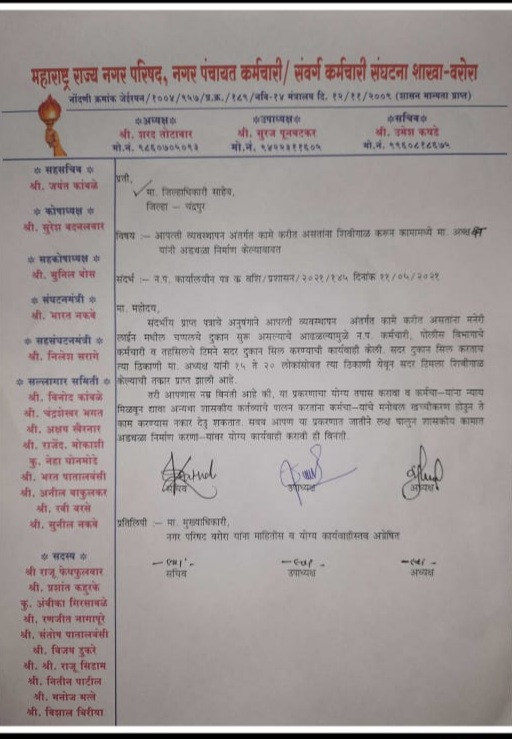 वरोरा शहरात आपत्ती व्यवस्थापन च्या अंतर्गत दुकानाना कडक लॉकडाऊन चे पालन करण्याचे आदेश असताना देखील शहरातील व्यापारी वर्ग छूप्या मार्गाने दुकाने सुरू ठेवत विक्री सुरूच होती .त्यामुळे आपत्ती व्यवस्थापन चमू ने कारवाई केली .चमू ने केलेल्या कारवाई विरोधात नगर परिषद वरोरा चे नगराध्यक्ष अहेतेशाम अली विना मास्क 15 ते 20 जणांसह घटनास्थळी येत चमुला शिवीगाळ करीत सील केलेले दुकाना वरील सील काढले व शासकीय कामात अडथळा आणत नगर परिषदेच्या कामात अडथळा आणल्याने कर्मचाऱ्यांचे मनोबल खच्ची झाल्याचे कर्मचारी संघटनेकडून सांगण्यात आले.शासकीय कामात अडथळा आणल्याप्रकरणी नगराध्यक्ष अहेतेशाम अली यांच्यावर योग्य कारवाई करावी अशी विनंती कर्मचारी संघटनेने निवेदना मार्फत जिल्हाधिकारी यांना केली आहे.जो पर्यंत कारवाई होत नाही तोपर्यंत काम बंद राहील असेही कर्मचारी संघटनेकडून सांगण्यात आले आहे.एकीकडे एका ठिकाणी गर्दी न करण्याचे आवाहन नगर परिषद कडूनच केल्या जाते .परंतु खुद्द नगर परिषद वरोरा चे नगराध्यक्ष अहेतेशाम अली यांनी केलेल्या गर्दी प्रकरणी काय कारवाई होईल ते विशेष.