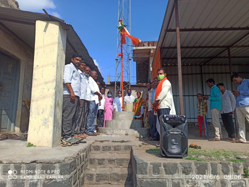 उभारून छत्रपती शिवाजी महाराज यांच्या विचारांना उजाळा देण्यात आला,छत्रपती शिवाजी महाराज याचे आत्मचरित्र सर्वांनी आत्मसात करावे आसे प्रतिपादन नवनिर्वाचित सरपंच लक्ष्मीबाई जाधव पोटेकर यांनी व्यक्त केले. यावेळी राष्ट्रगीत व महाराष्ट्र गीत म्हणून कार्यक्रमाची सांगता झाली. सूर्यास्ताला राजदंड स्वराज्य गुढी खाली घेण्यात येणार आहे.