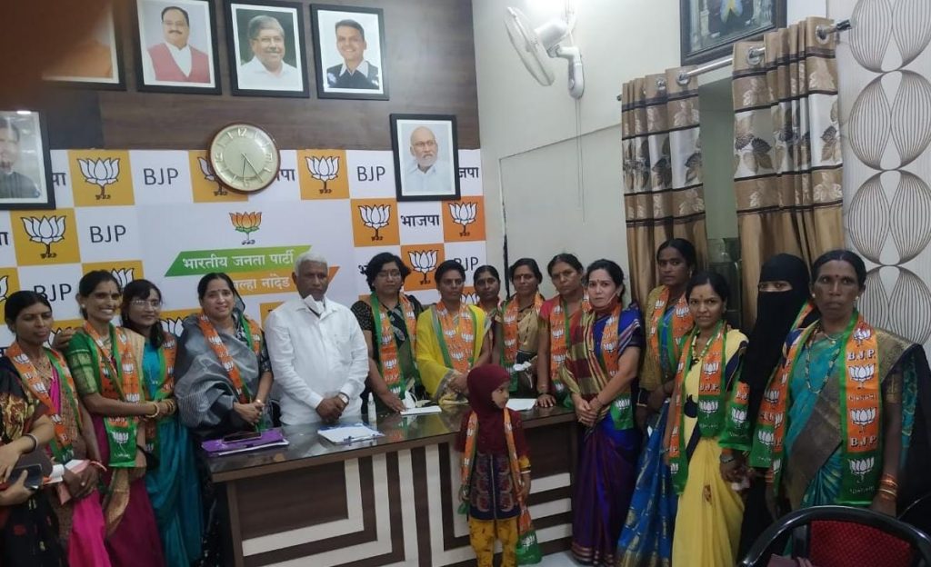 भाजपा कार्यालय नांदेड येथे जिल्हा अध्यक्ष मा व्यंकटराव पाटील गोजेगावकर साहेब यांच्या अध्यक्षतेखाली भाजपा महिला मोर्चा च्या वतीने विविध आघाड्याचे कार्यकारिणी जाहीर करण्यात आली . प्रमुख उपस्थिती भाजपा संघटनमंत्री गंगाधरराव जोशी,जिल्हा सरचिटणीस लक्ष्मणराव ठक्करवाड,भाजपा महिला मोर्चा जिल्हाध्यक्षा चित्राताई गोरे यांच्या प्रमुख उपस्थिती मध्ये नियुक्तीपत्र देण्यात आले त्यावेळी हदगाव तालुका अध्यक्ष निळू पाटील, भाजपा जिल्हा सरचिटणीस संगीता मेरगेवार,केतकी चौधरी जिल्हा सरचिटणीस,देगलूर तालुकाध्यक्षा मिनाक्षी बिरादार, देगलुर शहराध्यक्षा राधिका पटवारी, बिलोली तालुका अध्यक्षा शिवकन्या सुरकुलावार,लोहा तालुका अध्यक्षा सविता सातेगावे, भाजपा महिला मोर्चा नवनिर्वाचित पदाधिकारी व भाजपा कार्यकर्ते उपस्थित होते