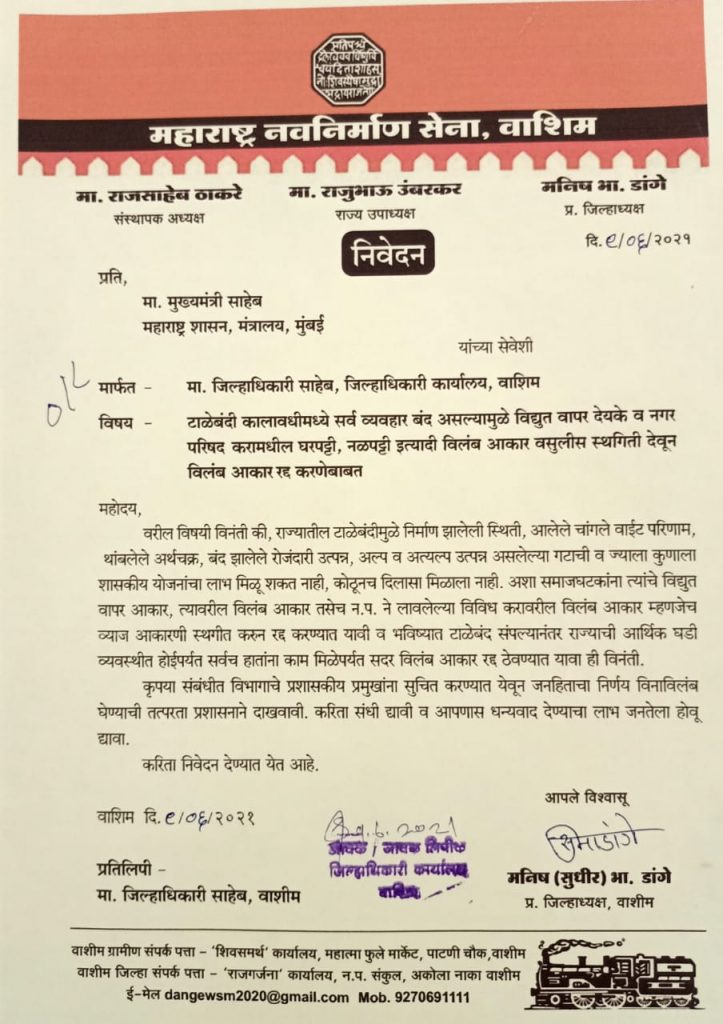 वाशिम – टाळेबंदी कालावधीमध्ये सर्व व्यवहार बंद असल्यामुळे विद्युत वापर देयके व नगर परिषद करामधील घरपट्टी, नळपट्टी इत्यादी विलंब आकार वसुलीस स्थगिती देवून विलंब आकार रद्द करण्याच्या मागणीसाठी महाराष्ट्र नवनिर्माण सेनेच्या वतीने ९ जून रोजी प्रभारी जिल्हाध्यक्ष मनिष डांगे यांच्या नेतृत्वात जिल्हाधिकारी यांच्यामार्फत मुख्यमंत्र्यांना निवेदन पाठविण्यात आले.