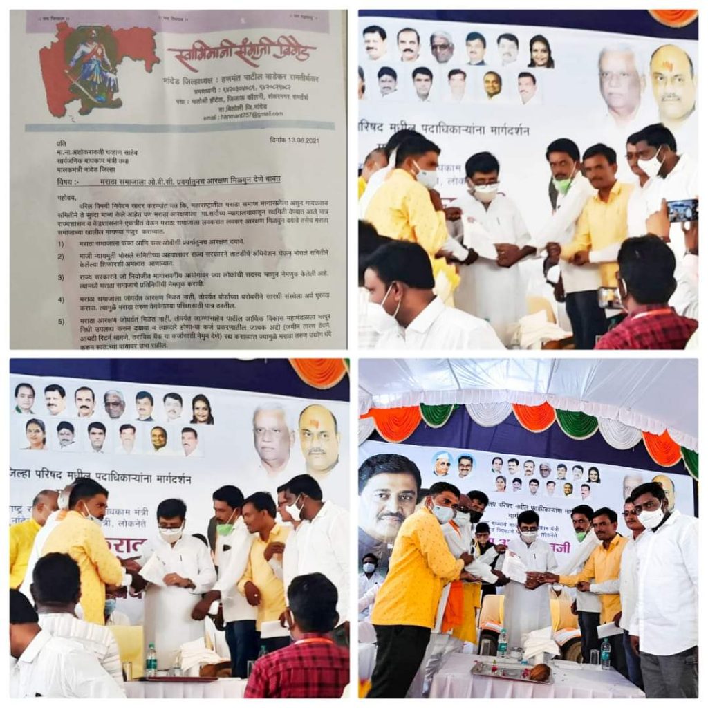 बिलोली तालुका दौऱ्यावर आले असता बिलोली तालुका सकल मराठा समितीच्या वतीने मराठा समाजाला ओबीसी प्रवर्गातूनच आरक्षण देण्यात यावे यासाठी बिलोली तालुक्यातील सर्व सकल मराठा समितीच्या वतीने निवेदन देण्यात आले.
