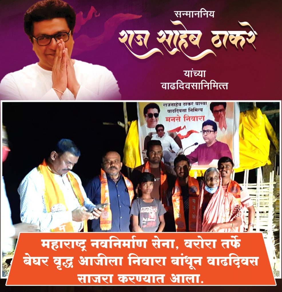 सन्माननीय राजसाहेब ठाकरे यांच्या वाढदिवसानिमित्त महाराष्ट्र नवनिर्माण सेना वरोरा तर्फे उपजिल्हा रुग्णालय वरोरा येथे फळ वाटप ,गरजू नागरिकांना मसालेभात जिलेबी वाटप ,निराधार वृद्ध बेघर महिलेला निवारा बांधून देत मा. राजसाहेब ठाकरे यांचा वाढदिवस अनोख्या पद्धतीने साजरा करीत सामाजिक उपक्रम राबविण्यात आला.एकीकडे कोरोना मुळे सर्वसामान्यांचे हाल होत असताना महाराष्ट्र नवनिर्माण सेना सर्व स्तरांवर पोहचुन सर्व सामान्य जनतेला मदत करीत आहे.शकुंतला येसंबरे ही वृद्ध निराधार महिला मागील 20 वर्षांपासून उघडयावर राहत होती ,पावसाळ्यात उघडयावर राहायला विशेष त्रास होत होता.भर पावसात छत्री च्या आधारे ही वृद्ध महिला राहत होती.महाराष्ट्र नवनिर्माण सेनेच्या पदाधिकारी प्रशांत बदकी व तालुकाध्यक्ष वैभव डहाने यांच्या निर्दशनास ही बाब येताच त्यांनी या महिलेला निवारा बांधून देण्याचे ठरवले त्यानुसार आज हा निवारा बांधून देण्यात आला.निवारा बांधताना यात प्रणय परिमल,कुणाल गौरकार, कल्पक ढोरे,प्रशांत बदकी तालुका सचिव ,वैभव काका डहाने तालुकाध्यक्ष व राजू कुकडे जिल्हा उपाध्यक्ष यांनी विशेष सहकार्य केले.महाराष्ट्र नवनिर्माण सेनेच्या पदाधिकाऱ्यांचे धन्यवाद मानत वृद्ध आजी ने आशीर्वाद दिले.