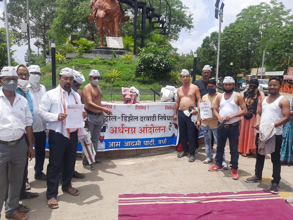 पेट्रोल व डिझेल दरवाढीच्या विरोधात वर्धा जिल्हा आम आदमी पार्टीच्या वतीने स्थानिक शिवाजी चौक वर्धा येथे केंद्र सरकारच्या विरोधात धरणे आंदोलन निदर्शने व अर्धनग्न आंदोलन करण्यात आली व त्यानंतर वर्धा जिल्हाधिकारी यांना निवेदन देण्यात आले, सदर निवेदन वर्धा जिल्हाधिकारी यांच्या माध्यमातून देशाचे पंतप्रधान नरेंद्र जी मोदी यांना पाठविन्यात आले, सध्या आंतरराष्ट्रीय बाजारात कच्च्या तेलाच्या बेरेलची किंमत अतिशय कमी झाली असून ,तरीदेखील पेट्रोल व डिझेलच्या किमतीत भरमसाठ वाढ केंद्र सरकारच्या वतीने करण्यात आली आहे आज पेट्रोल 103 रुपये प्रती लिटर वर पोहचले,त्या वाढीमुळे बाकी जीवनाश्यक वस्तू च्या किमतीत अचानक वाढ झाली असून, त्याचा असर देशातील सर्वसामान्य लोकांच्या जनजीवनावर झालेला आहे ,पहिलेच देशांमध्ये गेल्या दीड वर्षापासून कोरोनाव्हायरस या महामारी मुळे जनता भयभीत व आर्थिक विवंचनेत सापडले असून, लाखो लोकांचा रोजगार हिरावला गेला असून लॉकडाऊन काळात जनता घरीच बसून असल्यामुळे त्यांना कोणत्याही प्रकारचे व्यवसाय अर्थार्जन करता आले नाही,अशा परिस्थितीत केंद्र सरकारच्या वतीने पेट्रोल व डिझेलची वाढ ही एक अप्रिय घटना आहे ,तेव्हा केंद्र सरकारने ही दरवाढ ताबडतोब रद्द करावी या स्वरूपाचे निवेदन जिल्हाध्यक्ष प्रमोद भोमले यांचे नेतृत्वात आम आदमी पार्टीच्या वतीने वर्धा जिल्हाधिकारी यांना देण्यात आले,