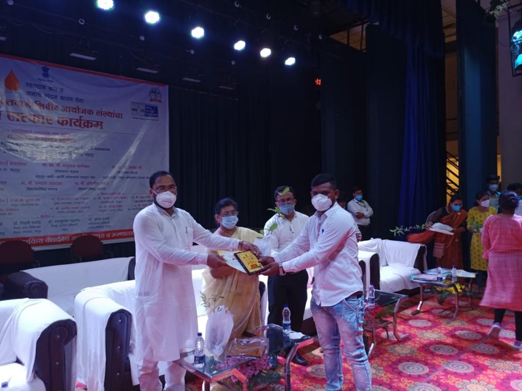 चंद्रपूर: 14 जून जागतिक रक्तदातादिनाचे औचित्य साधून आज राज्य रक्त संक्रमण परिषद, महाराष्ट्र राज्य, महाराष्ट्र शासन आरोग्य विभाग मुंबई व रक्तकेंद्र सामान्य रुग्णालय व शासकीय वैद्यकीय महाविद्यालय चंद्रपूर यांच्या संयुक्त विद्यमाने रक्तदान शिबीर आयोजक संस्था व रक्तदाते यांच्या सत्कार समारंभाचे आयोजन आज चंद्रपूर येथील प्रियदर्शनी इंदिरा गांधी सांस्कृतिक सभागृह येथे करण्यात आले होते.ज्यांनी कोरोना काळात रक्तदान शिबिराचे आयोजन यशस्वीरित्या केले व सामाजिक दायित्व जपले त्या सर्व संस्थांचा व रक्तदात्यांचा भव्य असा सत्कार समारंभ करण्यात आला.यात नाते आपुलकीचे सदस्य सामाजिक कार्यकर्ते समाजसेवा फाउंडेशनचे अध्यक्ष श्री सचिन भाऊ उपरे तसेच 58 वेळा रक्तदान करणारे दैनिक महासागरचे जिल्हा प्रतिनिधी श्री.जीतेंद्र मशारकर यांचा सत्कार करण्यात आला. कार्यक्रमाला उपस्थित चंद्रपूरचे पालकमंत्री मा.ना.श्री.विजयभाऊ वडेट्टीवार मंत्री महाराष्ट्र शासन तथा चंद्रपूरचे विद्यमान आमदार मा.किशोरभाऊ जोरगेवार, जिल्हा परिषद अध्यक्षा श्रीमती.संध्याताई गुरनुले, जिल्हाधिकारी मा. श्री.अजय गुल्हाने, जिल्हा आरोग्य अधिकारी राजकुमार गहलोत, शासकीय वैद्यकीय महाविद्यालय चंद्रपूर चे अधिष्ठाता डॉ. अविनाश टेकाडे डॉ सोनकुसरे, जिल्हा शल्य चिकित्सक जिल्हा रुग्णालय चंद्रपूर चे डॉ. निवृत्ती राठोड, रक्तसंक्रमण अधिकारी सामान्य रुग्णालय चंद्रपूर डॉ. अनंत हजारे या सर्व मान्यवरांची उपस्थिती होती.