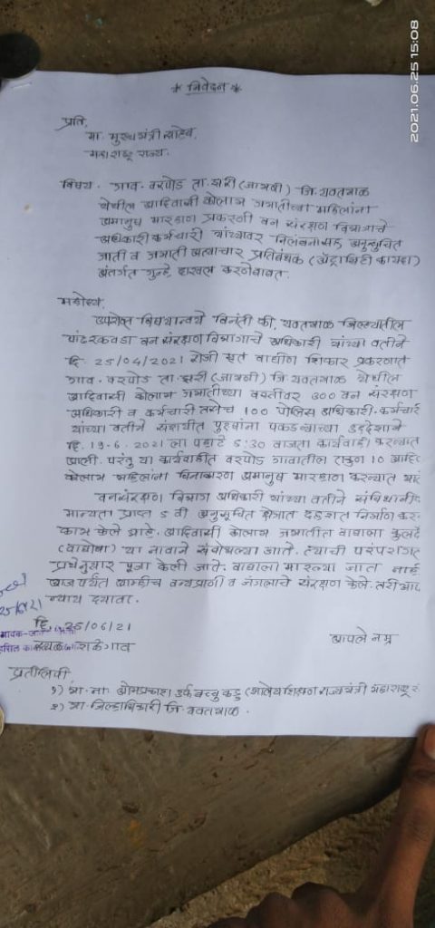 यवतमाळ जिल्ह्यामधील झरी या तालुक्यातील वरपोड येथील आदिवासी जमातीच्या महिलांना अमानुष मारहाण करण्यात आली. या प्रकरणाची वन संरक्षण विभागाचे अधिकारी कर्मचारी यांच्यावर निलंबनाची अनुसूचित जाती व जमातीच्या त्याचार प्रतिबंधक कायदा अंतर्गत गुन्हे दाखल करा अशी मागणी मुख्यमंत्र्यांना पाठविण्यात आले .पांढरकवडा व संरक्षण विभागाचे अधिकारी यांच्या वतीने वाघाची शिकार प्रकरणात गाव वरपोड तालुका झरी जामणी जिल्हा यवतमाळ येथील आदिवासी कोलाम जमातीच्या वस्तीवर तीनशे वनसंरक्षण अधिकार अधिकारी व कर्मचारी आणि शंभर पोलीस अधिकारी कर्मचारी यांच्या वतीने संशयित पुरुषांना पकडण्याच्या उद्देशाने कारवाई करण्यात आली. परंतु या कार्यवाहीत वरपोड गावातील एकूण आदिवासी कोलाम महिलांना विनाकारण अमानुष मारहाण करण्यात आली .गर्भवती महिला व एक अल्पवयीन मुलगी होती .त्यांना सुद्धा व वन विभागाच्या कर्मचाऱ्यांनी अधिकार्यांनी यांनी बेदम मारहाण केली .अनुसूचित क्षेत्रात दहशत निर्माण करण्याचे काम केले आहे. आदिवासी कोलाम समाजात वाघाला कुलदैवत वाघोबा या नावाने संबोधले जाते त्यांनी पारंपरिक पध्दती नुसार पूजा केली जाते .वाघाला मारल्या जात नाही .तसे असते तर टिपेश्वर अभयारण्यातील एकही वाघ शिल्लक राहिला नसता. विनाकारण आदिवासी कोलाम समाजातील महिलांना मारहाण करण्यात आली. वन संरक्षण विभागाचे अधिकारी कर्मचारी यांच्यावर निलंबनाची अनुसूचित जाती व जमाती अत्याचार कायद्या अंतर्गत ॲट्रॉसिटी कायदा अंतर्गत दाखल करावी. अशी मागणी राळेगाव तालुक्यातील सावरखेड येथील कोलाम समाज यांच्या वतीने राळेगाव तहसीलदार साहेब यांना निवेदन देण्यात आली.या वेळी निवेदन देताना. मा.अमित सूर्यभान ढोबळे, मंगेश मा.आत्राम.सुरेश जुनघरे, अनिल निंबादेवी, आकाश ढोबळे, मोहन जुनघरे, विशाल सुकली, काशिनाथ टेकाम मुकेश आत्राम, आदी कोलाम समाज उपस्थित होते..