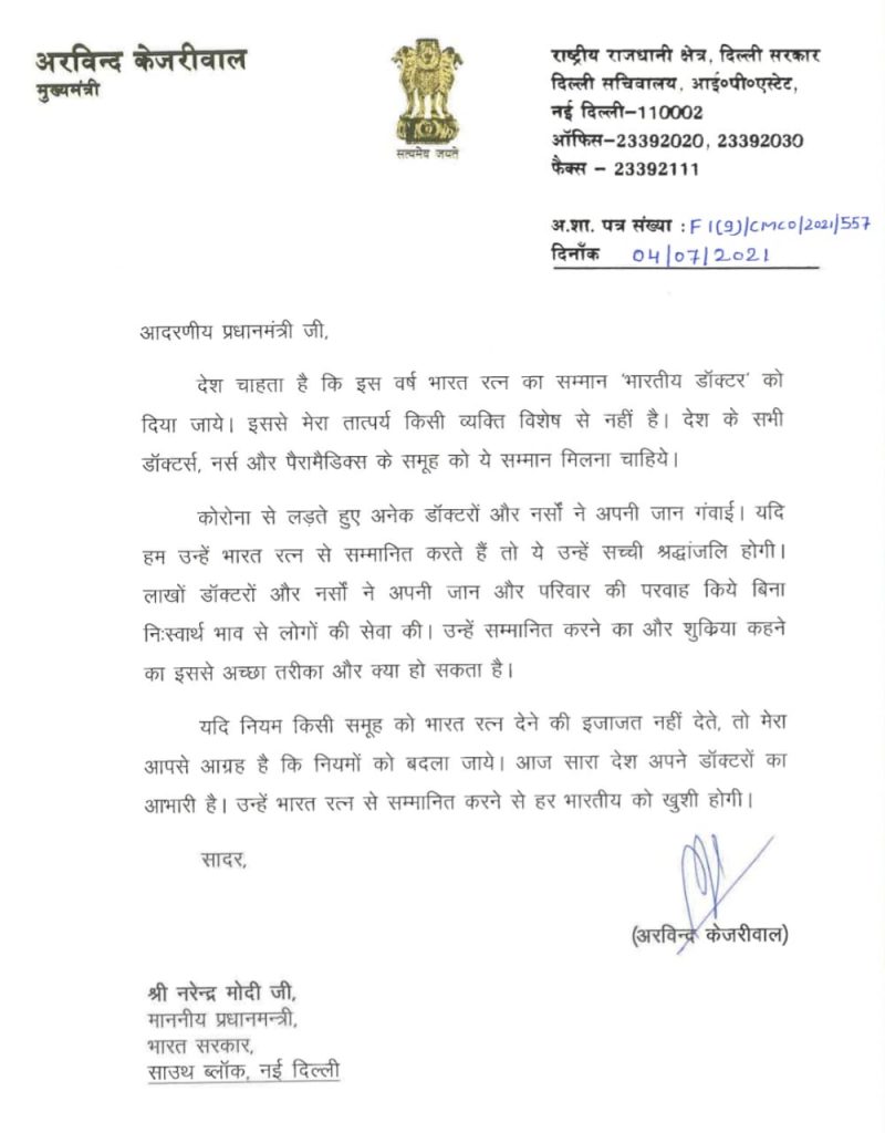 कोरोना च्या बिकट परिस्थितीत स्वतःच्या जीवाची चिंता न करता रुग्णसेवेत झटणाऱ्या डॉक्टर ,नर्सेस ना देशाचा सर्वात महत्वाचा असलेला भारत रत्न या अवॉर्ड ने सन्मानित करावे अशी विनंती दिल्ली चे मुख्यमंत्री अरविंद केजरीवाल यांनी पंतप्रधान नरेंद्र मोदी यांना पत्राद्वारे केली आहे .