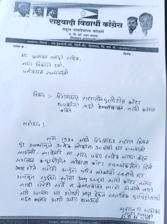 सन १९८६ मधी हिंगणघाट शहरात आलेल्या पुरा मध्ये अनेक लोकांना आपली घर गमवावी लागली. त्या वेळी मा. शरद पवार साहेब मुख्यमंत्री असताना पुरपिडीत लोकांना शासणा तर्फे क्वार्टर घर देण्यात आले . याच संदर्भात आज हिंगणघाट राष्ट्रवादी युवक व विद्यार्थी काँग्रेस पदाधिकार्यांनी शहरातील पुरपिडीत क्वार्टर धारकांचा सिटी सर्व्हे करून लवकरात लवकर त्यांना त्यांचे पट्टे नावी करून द्या ही मागणी वर्धा जिल्हा राष्ट्रवादी काँग्रेस पार्टीचे निरीक्षक तथा नगरविकास ऊर्जा,आदिवासी उच्च तंत्र शिक्षण विभाग,पुर्नवसन राज्यमंत्री प्राजक्त तनपुरे साहेब यांचे वर्धा जिल्ह्यातील कार्यकर्ता मार्गदर्शन मेळावा दरम्यान हिंगणघाट शहर राष्ट्रवादी विधयार्थी काँग्रेस चे शहर उपाध्यक्ष युवराज माऊसकर यांनी केली.