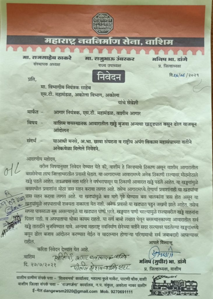 महाराष्ट्र नवनिर्माण सेनेचे विभाग नियंत्रक अकोला व आगार व्यवस्थापक यांना निवेदन वाशिम बसस्थानक आवारातील खड्डे बुजवा अन्यथा खड्यात बसुन ढ़ोल वाजवून निद्रा अवस्थेत झोपलेल्या प्रशासनाला जागे करण्यासाठी आंदोलन घेण्यात येईल असा ईशारा जिल्हाध्यक्ष मनिष डांगे महाराष्ट्र सैनिक मोहन कोल्हे विठ्ठल राठोड ,प्रतिक कांबळे ,प्रवीण फुलसावगे ,सतिश महल्ले आदी उपस्थित होते