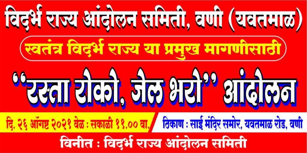 विदर्भ राज्य आंदोलन समितीच्या वतीने स्वतंत्र विदर्भ राज्य या प्रमुख मागणीसाठी विदर्भातील 11 ही जिल्ह्यात आणि 120 तालुक्यात 26 ऑगस्ट 2021 रोज गुरुवार ला रस्ता रोको जेल भरो आंदोलन होणार आहे त्याचाच एक भाग म्हणून दिनांक 26 ऑगस्ट ला वणी येथील साई मंदिर समोर यवतमाळ रोड 11 वाजता रस्ता रोको जेल भरो आंदोलन करण्यत येणार आहे असे विदर्भ राज्य आंदोलन समितीच्या दिनांक 22 आगष्ट रोज रविवार ला झालेल्या बैठकीत निर्णय घेण्यात आला.यावेळी विदर्भ राज्य आंदोलन समितिचे रफिक रंगरेज,देवराव धांडे,अमित उपाध्ये,सृजन गौरकर,राजू पिंपळकर,संजय चिंचोळकर,मंगेश रासेकर,विकेश पानघाटे,प्रमोद खुरसाने,राहुल खारकर इत्यादी उपस्थित होते.