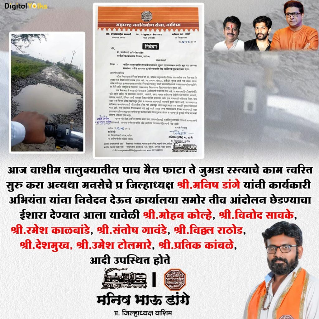 आज वाशीम तालुक्यातील पाच मैल फाटा ते जुमडा रस्त्याचे काम त्वरित सुरु करा अन्यथा मनसेचे प्र जिल्हाध्यक्ष मनिष डांगे यांनी कार्यकारी अभियंता यांना निवेदन देऊन कार्यालया समोर तीव्र आंदोलन छेडण्याचा ईशारा देण्यात आला यावेळी मोहन कोल्हे ,विनोद सावके ,रमेश काळबांडे ,संतोष गावंडे विठ्ठल राठोड ,श्री देशमुख उमेश टोलमारे प्रतिक कांबळे ,आदी उपस्थित हो