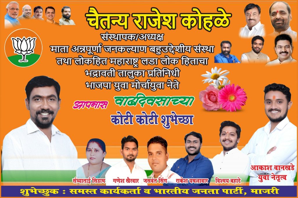 चैतन्य राजेश कोहळे ,माता अन्नपूर्णा जनकल्याण बहूउद्देशीय संस्था तथा लोकहीत महाराष्ट्र भद्रावती प्रतिनिधी भा ज पा युवा नेते आपणास वाढदिवसाच्या हार्दिक शुभेच्छा