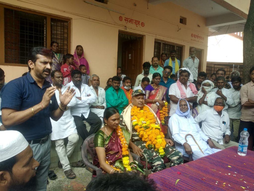 हिमायतनगर तालुक्यातील भुमी पुत्रCRPFजवान कैलास गोविंदराव सावते यांचे हिमायतनगर नगरी मध्ये ढोलताशा लावुन मिरवणूक काढुन अताषबाजी करून स्वागत करण्यात आले कैलास सावते यांनी २७ वर्ष भारत मातेचे रक्षण केले पुढे करीत राहील देश सेवा हीच ईश्वर सेवा आहे असे मनोगत देखील त्यांनी व्यक्त केले आज आपल्या देशाला नवजवान यांची गरज आहे प्रत्येकांनी आपल्या देशासाठी थोडा वेळ दिला पाहिजे असे वक्तव्य त्यांनी यावेळी केले आहे कैलास सावते हे सेवानिवृत्त झाले असून पुढील प्रवास सुखी समृद्धी जावो आशा शब्दात देखील हिमायतनगर तालुक्यातील सेवा समितीने त्यांना शुभेच्छा दिल्या यावेळी तालुक्यातील सर्व गावकरी मंडळी मित्र परिवार उपस्थित होता.