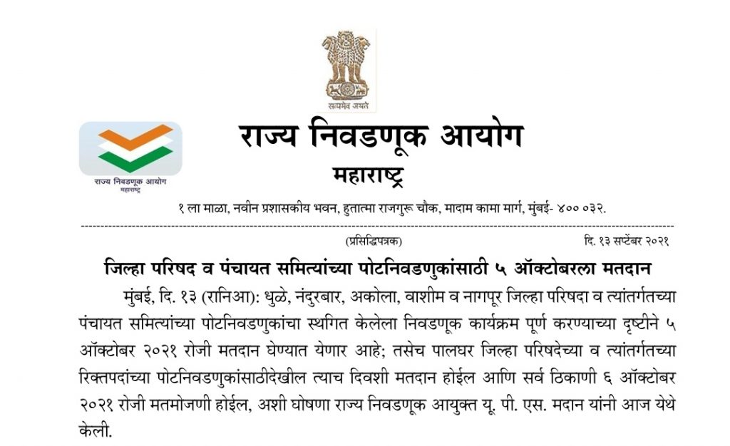५ ऑक्टोबर २०२१ रोजी मतदान घेण्यात येणार आहे; तसेच पालघर जिल्हा परिषदेच्या व त्यांतर्गतच्या रिक्तपदांच्या पोटनिवडणुकांसाठी देखील त्याच दिवशी मतदान होईल आणि सर्व ठिकाणी ६ ऑक्टोबर २०२१ रोजी मतमोजणी होईल, अशी घोषणा राज्य निवडणूक आयुक्त यू. पी. एस. मदान यांनी केली.