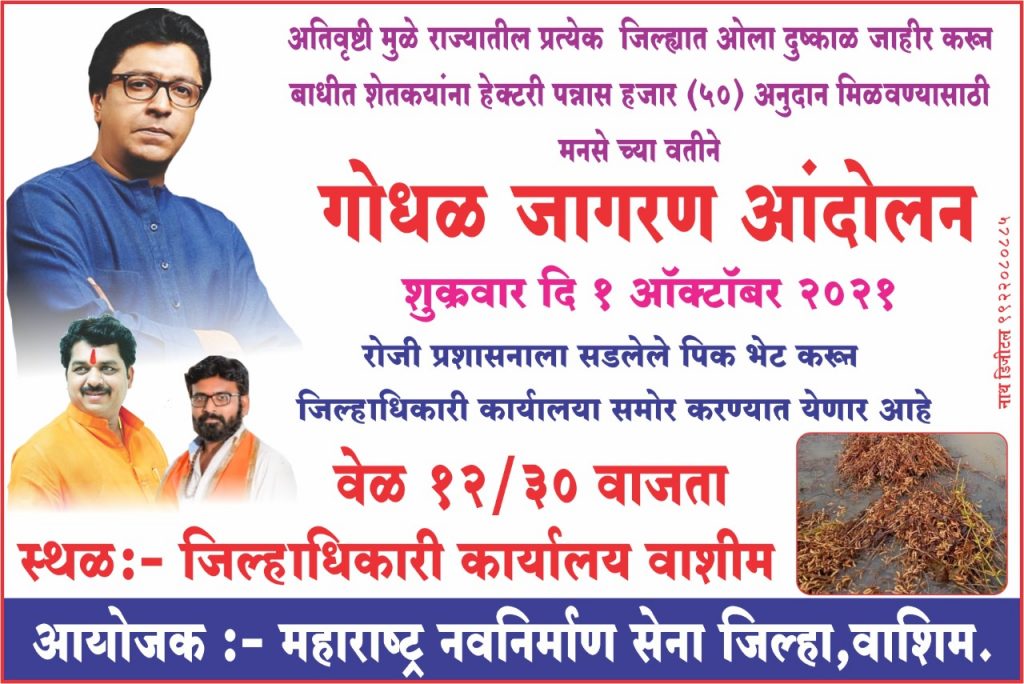 अतिवृष्टी मुळे राज्यात, जिल्ह्यात ओला दुष्काळ जाहीर करून बाधीत शेतकऱ्यांना हेक्टरी पन्नास हजार (50) अनुदान मिळवण्यासाठी मनसे च्या वतीने शुक्रवार दि 1 ऑक्टॉबर 2021रोजी प्रशासनाला सडलेले पिक भेट करून गोधळ जागरण आंदोलन जिल्हाधिकारी कार्यालया समोर करण्यात येणाऱ्या आंदोलनातं सहभागीव्हा असे आव्हान प्र जिल्हाध्यक्ष मनिष डांगे महाराष्ट्र सैनिक मोहन कोल्हे गजानन वैरागडे ,सुहास जाधव परशराम दंडे गोपाल मोटे विठ्ठल राठोड विनोद सावके प्रतिक कांबळे सुनील अवगण देवा खरे राजु शिराळ समाधान खरे उमेश टोलमारे सतिश कडवे मनिष महल्ले ,हर्षद चव्हाण वेदांत ढवळे आदी उपस्थित होते