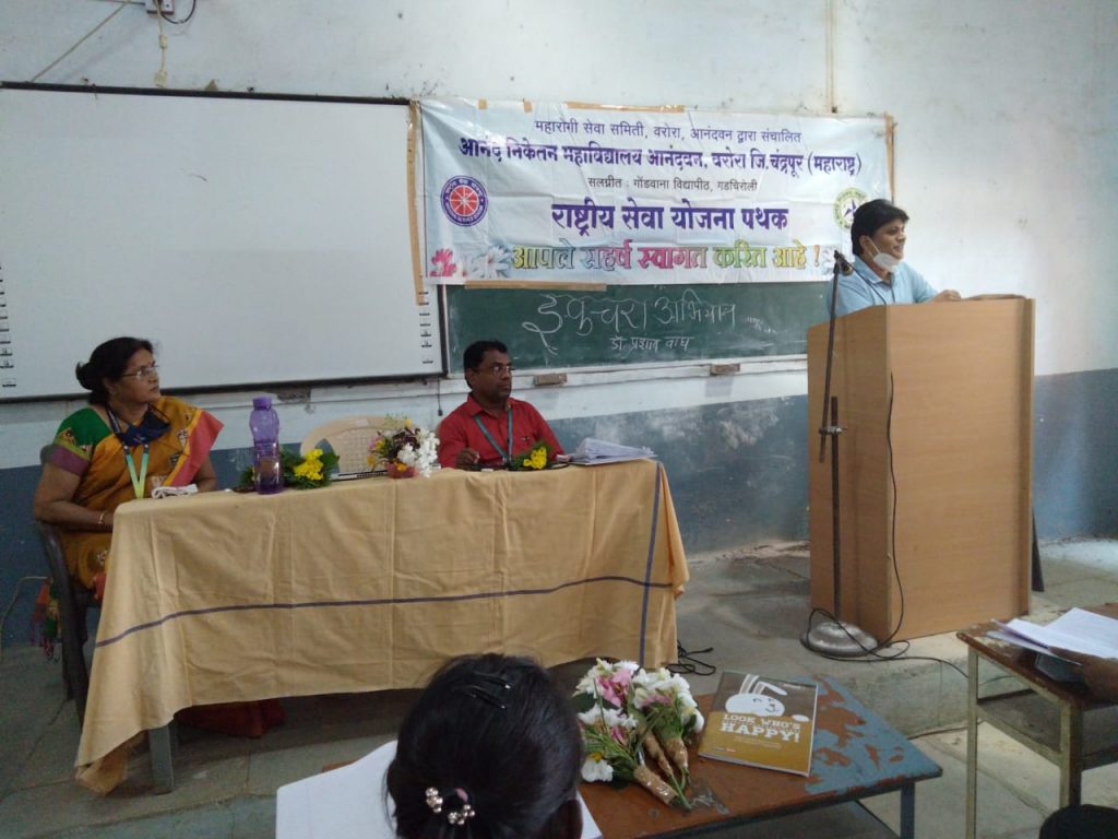 महारोगी सेवा समिती, आनंदवन, वरोरा. व्दारा संचालित तथा गोंडवाना विद्यापीठ, गडचिरोली. संलग्नित. आनंद निकेतन महाविद्यालय, आनंदवन, वरोरा. माननीय प्राचार्य यांनी कार्यक्रम यशस्वीते साठी शुभेच्छा दिल्या. यावेळी कार्यक्रमाचे अध्यक्षस्थानी डॉ. रंजना लाड. यांनी आपल्या अध्यक्षीय भाषणात बोलताना उन्नत भारत अभियान, राष्ट्रीय सेवा योजना अंतर्गत ३१ ऑक्टोबर पर्यंत स्वच्छ भारत अभियान सुरू आहेत. यासंदर्भात माहिती दिली. आजच्या कार्यक्रमाचे प्रमुख वक्ते व ई-कचरा संकलन चे समन्वयक डॉ.प्रशांत वाघ यांनी दिवसेंदिवस वाढणाऱ्या इ- कचऱ्याचे प्रमाण, त्याची विल्हेवाट कशी लावावी, आपल्या महाविद्यालयात ई-कचरा संकलन का सुरू करण्यात आले. ई कचऱ्याच्या समस्येवरील उपाययोजना म्हणजे रिड्युज, रियुज आणि रिसायकल या त्रिसुत्रीचा वापर करून ई- कचऱ्याच्या समस्येवर नियंत्रण मिळवु शकतो. पण त्यासाठी हा ई – कचरा एकत्रितपणे गोळा करणे गरजेचे आहे. याकरिता आपल्या महाविद्यालयात हे केंद्र सुरू करण्यात आले. या ई कचऱ्याची विल्हेवाट लावण्यासाठी सुरीटेक प्रायव्हेट लिमिटेड बुटीबोरी यांनी ही जबाबदारी उचललेली आहे. या सामाजिक कार्यात विशेष करून राष्ट्रीय सेवा योजनेचे स्वयंसेवक यांनी सहभागी व्हावे.कार्यक्रमाच्या प्रस्तावनेत राष्ट्रीय सेवा योजना सहकार्यक्रम अधिकारी डॉ. नरेंद्र पाटील. यांनी समाजातील प्रत्येक क्रियेचे भान ठेवून ३६५ दिवस आपली जबाबदारी निस्वार्थपणे पार पाडली पाहिजे असे विचार स्वयंसेवकांन प्रतिपादन केले. राष्ट्रीय सेवा योजना विभाग प्रमुख तथा कार्यक्रम अधिकारी डॉ. रंजना लाड. यांनी देखील कार्यक्रमाला विशेष उपस्थिती दर्शवून नाविन्यपूर्ण स्वयंसेवकांना राष्ट्रीय सेवा योजनेची शिस्तबद्ध अंमलबजावणीची परिपूर्ण माहिती दिली. कार्यक्रमाचे सूत्रसंचालन कु. निकिता कापसे. आभार प्रदर्शन कु. अस्मिता लाभणे. यांनी केले तसेच कार्यक्रमाला स्वयंसेवकांचे भव्य उपस्थिती होती. व कार्यक्रमाची सांगता राष्ट्रगिताने करण्यात आली