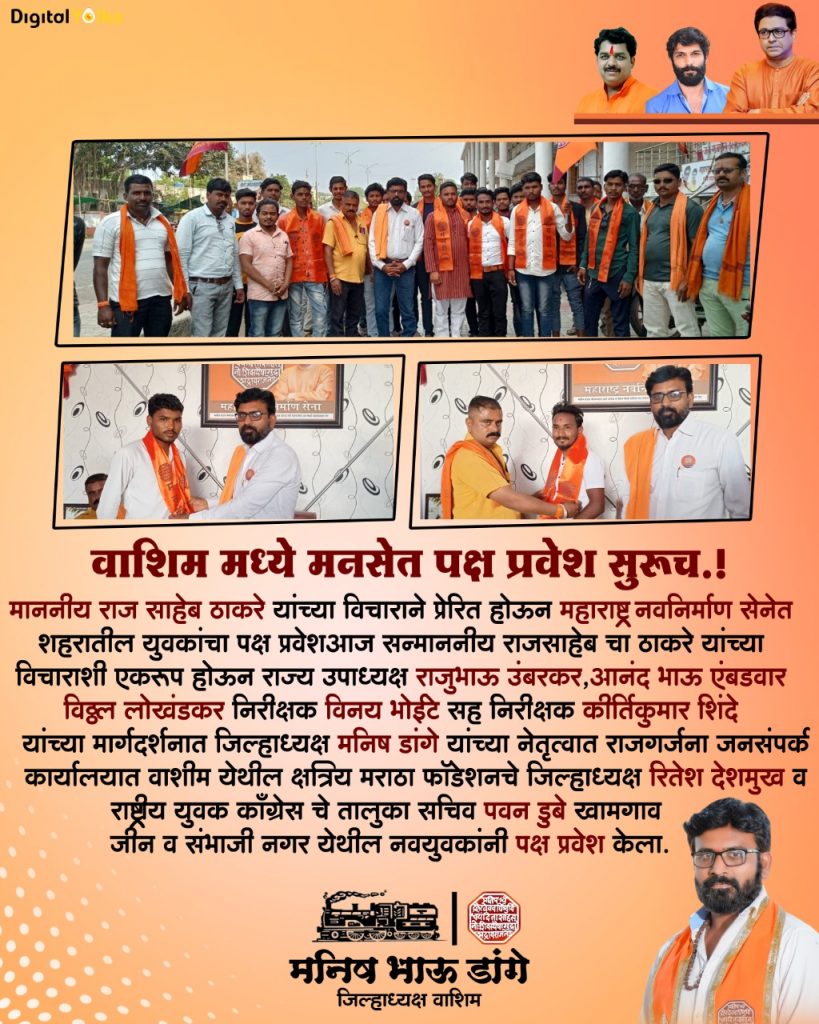 आज सन्माननीय राजसाहेब चा ठाकरे यांच्या विचाराशी एकरूप होऊन राज्य उपाध्यक्ष राजुभाऊ उंबरकर ,आनंद भाऊ एबडवार विठ्ठल लोखंडकर निरीक्षक विनय भोईटे सह निरीक्षक कीर्तिकुमार शिंदे यांच्या मार्गदर्शनात जिल्हाध्यक्ष मनिष डांगे यांच्या नेतृत्वात राजगर्जना जनसंपर्क कार्यालयात वाशीम येथील क्षत्रिय मराठा फॉडेशनचे जिल्हाध्यक्ष रितेश देशमुखआदित्य व रा युवक कॉ चे ता सचिव पवन डुबे खामगाव जीन व संभाजी नगर येथील नवयुवक जामकर वैभव काळे शैलेश देशमुख गणेश शिंदे सौरभ पांडे शुभम सूर्यवंशी अजय चंदनशिव सतिष घोडे कृष्णा बागर प्रतिक कांबळे गजानन मुखमाले विष्णू वानखेडे सूरज खडसे योगेश चोपडे बालाजी जोगदंड हर्ष मेहता शिवम कनसे अभिजित पुरी अनिल बांगर ऋतिक कांबळे आदी नवयुवकांनी पक्ष प्रवेश केला कार्यक्रमाचे आयोजन मोहन कोल्हे कृष्णा इंगळे प्रतिक कांबळे उमेश टोलमारे शिवराज टोलमारे वेदांत ढवळे सुहास जाधवआशिष टोलमारे मयुरेश स्तराके आदीनी केले यावेळी किशोर गजरे अर्जुन कव्हर शंकर कव्हर देवानंद खरे समाधान खरे राहुल करवते प्रकाश कवडे सुनील अवगण सोमा कदम राजु महल्ले उपस्थित होते
