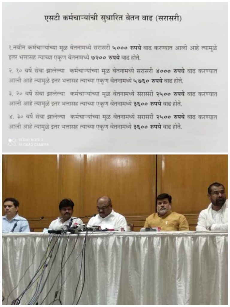 मुंबई ऐन दिवाळीमध्ये सुरु झालेला एसटी कर्मचार्यांचा संप सुटेल अशी आशा निर्माण झाली आहे. राज्य सरकारकडून सटी कर्मचार्यांना पगारवाढ या महिन्यापासून जाहीर केली आहे. राज्य सरकारने अंतरिम वेतनवाढीच्या प्रस्तावाला एस. टी. कर्मचारी शिष्टमंडळाने मंजुरी दिली आहे. यामुळे मागील तीन आठवड्यांहून अधिक काळ एसटी बंद आहे.परिवहन मंत्री अनिल परब यांनी पत्रकार परिषदेत झालेल्या निर्णयाची माहिती दिली. यावेळी भाजप आमदार गोपीचंद पडळकर, आमदार सदाभाऊ खोत यांच्यासह मंत्री उदय सामंत यांची उपस्थिती होती.