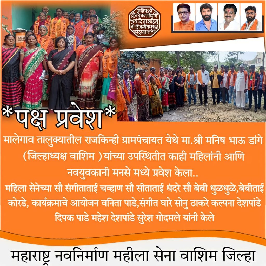 आज सन्माननीय राजसाहेब ठाकरे यांच्या विचाराशी एकरूप होऊन राज्य उपाध्यक्ष राजुभाऊ उंबरकर ,आनंद भाऊ एबडवार विठ्ठल लोखंडकर निरीक्षक विनय भोईटे सह निरीक्षक कीर्तिकुमार शिंदे यांच्या मार्गदर्शनात आज मनसे व महिला सेनेत महिला व नवयुक,जेष्ठाचा पक्ष प्रवेश मालेगाव तालुक्यातील राजकिन्ही ग्रामपंचायत येथील संत तुकडोजी महाराज मंदिर येथे जिल्हाध्यक्ष मनिष डांगे यांच्या नेतृत्वात महिला सेनेच्या सौ संगीताताई चव्हाण सौ सीताताई धंदरे सौ बेबी धुळधुळे,बेबीताई कोरडे,गजानन वैरागडे अमोल मापारी गणेश इंगोले यांच्या उपस्थितीत पार पडला यावेळी महिला नवयुवक जेष्ठ नागरिक यांनी पक्ष प्रवेश केला कार्यक्रमाचे आयोजन वनिता पाडे,संगीत घारे सोनु ठाकरे कल्पना देशपांडे दिपक पाडे महेश देशपांडे सुरेश गोदमले यांनी केले आदी युवक महादेव शिखरे सीताराम खुळे शुभम झाटे विलास ठाकरे नारायण टाले गजानन करवते कृष्णा रोकडे सुनील पारधी शिवा पारडे जावेद पठाण उत्तम विलायतकर भगवान आधळे महिला सेना पुजा गोदामले शकुतला राठोड कलीमुनीसा पठाण गंगा सरोदे रेखा सरोदे सिदू घुगे माधुरी कुलकर्णी लता इंगळे प्रमिला इंगळे लक्ष्मीबाई खुळे लता पारधी सोनु डाखोरे सलिमाबी पठाण कांता देशपांडे चंद्रभागा धीप्पाडे रेखा जाधव पुजा गोदमले आदी महिलानी पक्ष प्रवेश केला