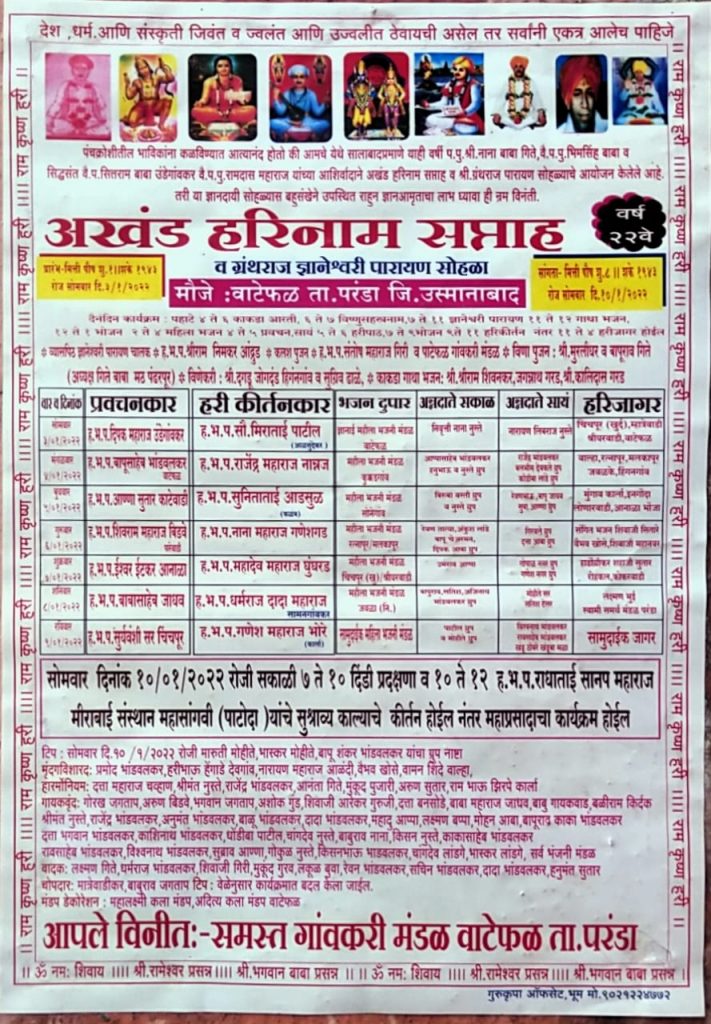 महाराष्ट्र ही संतांची भूमी आहे. म्हणून या भूमीला खर्या अर्थाने संत परंपरेच अनुष्ठान लाभलं आहे. संत परंपरेमुळे महाराष्ट्राला मोठा वारसा लाभला आहे. याच माध्यमातून हा वारकरी सांप्रदाय खर्या अर्थाने संपूर्ण जगभरात पोहोचायला मदत झाली. संत ज्ञानेश्वर, संत एकनाथ, संत गोरा कुंभार, संत चोखामेळा, संत जनाबाई, संत तुकाराम, संत नामदेव, संत निवृत्तीनाथ, संत मुक्ताबाई, संत सावता माळी, संत सोपानदेव यांच्यासोबतच अनेक संतांनी आपल्या अभंगातून, निरुपणातून समाजाला एक सकारात्मक दिशा देण्याच काम केलं.अनेक वर्षाची परंपरा असलेला अखंड हरिनाम सप्ताह मोठ्या भक्तिभावाने ०३जानेवारी २०२३पासून परंडा तालुक्यातील वै. संत भगवान बाबा ,वैसिद्ध संत सिताराम बाबा उंडेगावकर, फुलगिर बाबा यांच्या आशिर्वादाने पावन भुमीत.वैराग्य मुर्ती महंत संतोष महाराज गिरी ह.भ.प.राधाताई भांडवलकर ,धर्मराज पाटील,मोहन भांडवलकर, बापुकाका,रावसाहेब भांडवलकर मोहिते सर व इतर गावकऱ्यांच्या मार्गदर्शनाखाली सालाबादप्रमाणे यावर्षी वाटेफळ गावात ह.भ.प.मुरलीधर होनकळस महाराज,ह.भ.प.हनुमंत (भाऊ)भांडवलकर व सर्व वारकरी टाळकरी ,गावकऱ्यांच्या शुभहस्ते वीणा पुजन करुन अखंड हरिनाम सप्ताहात प्रारंभ होत आहे…नामवंत दिग्गज कीर्तनकारांची कीर्तने, प्रवचने महिला भजनाची मधुर वाणीतून सेवा होणार आहे. पहाटे काकडा आरती,विष्णुसहस्रनाम ,ज्ञानेश्वरी पारायण गाथा भजन, भारुडे, प्रवचन , सायांकाळी हरिपाठ आणि रात्री किर्तन नंतर सामुदायिक हरीजागर केला जातो. असा साधारण हरिनाम सप्ताहाचा दिनक्रम असतो. महाराष्ट्रात शेकडो वर्षांची परंपरा असलेले अखंड हरिनाम सप्ताह आजतागायत चालू आहेत.सप्ताह म्हणजे वारकरी संप्रदायाची उपासना आहे. या सात दिवसात संतांचे अखंड नामचिंतन असेल .