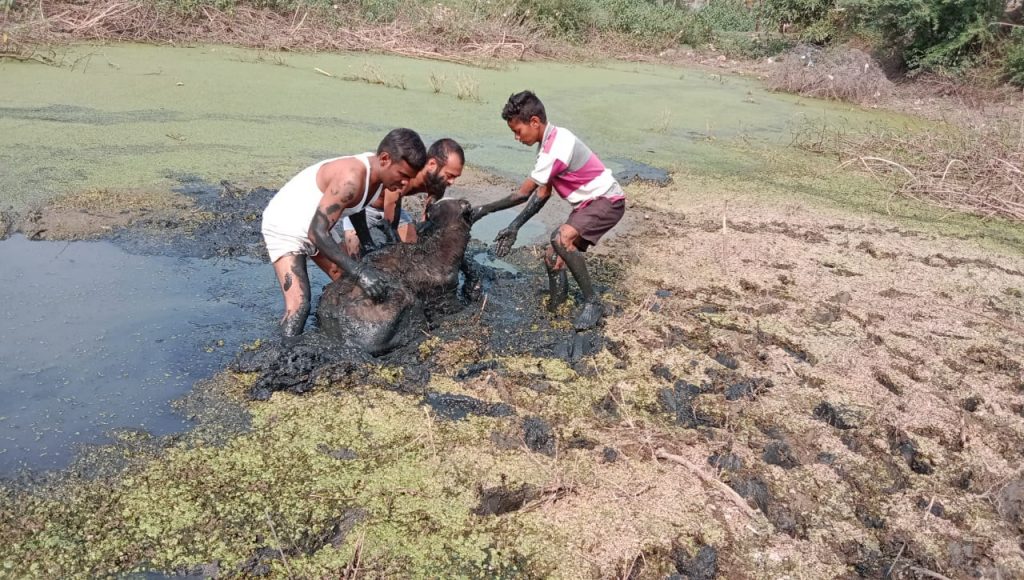 चंद्रपूर मधील बाबुपेठ येथे लुबींनी नगर येथील एका गड्ड्यात दलदल मध्ये फसून मृत्यूच्या उंबरठ्यावर उभे असलेल्या म्हशी च्या वासराला आम आदमी पार्टी बाबूपेठ चा कार्यकर्त्यांनी जीवन दान दिले.बाबुपेठ परिसरातील प्रभाग क्रमांक १७ येथिल लिंबीनी नगर, आंबेडकर नगर, हिंगलाज भवानी वॉर्ड, विक्तू बाबा चौक, दर्या नगर या वर्डात मोठ्या प्रमाणात विटा भट्टीचे, चूनखडीचे गड्डे आहेत ज्यामुळे येथे जाणमालाची नुकसान होत असते याबाबत आम आदमी पार्टी चे शहर सचिव राजू भाऊ कुडे येथील जनतेला सोबत घेऊन वारंवार महानगर पालिकेच्या निदर्शनात आणून देत राहिले आहेत तरी सुध्दा महानरपालिकेने याकडे अक्षरशः दुर्लक्ष केले आहे, जर हे गड्डे तात्काळ बुजवले गेले नाहीत तर आम आदमी पार्टी बाबूपेठ तर्फे प्रभाग क्रमांक १७ मधील जनतेला सोबत घेऊन मनपा प्रशासन विरोधात रस्त्यावर उतरेल आणि यास मनपा प्रशासन जबाबदार राहील असे आप चे शहर सचिव राजू कुडे यांनी म्हटले आहे .