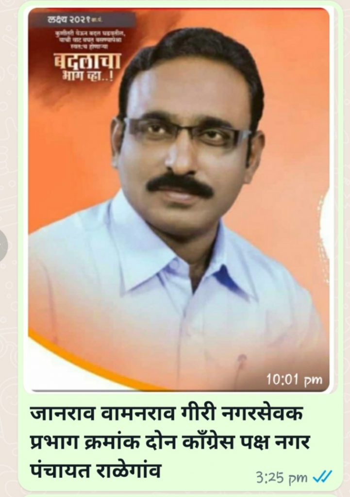 या प्रभागात एकंदर सहा उमेदवार निवडणूक रिंगणात उभे होते. काँग्रेस पक्षाचे जानराव गीरी यांना दोनशे अठ्ठाहत्तर मते, पाचशे पच्चावन मतां पैकी मिळाल्याने,पन्नास टक्के अधीक मते मिळवून विजयी श्री मिळवली आहे. जानरावभाऊ गीरी हे चारदा सलग ग्रामपंचायत राळेगांव चे सदस्य, उपसरपंच,पंचायत समिती राळेगांव चे सदस्य