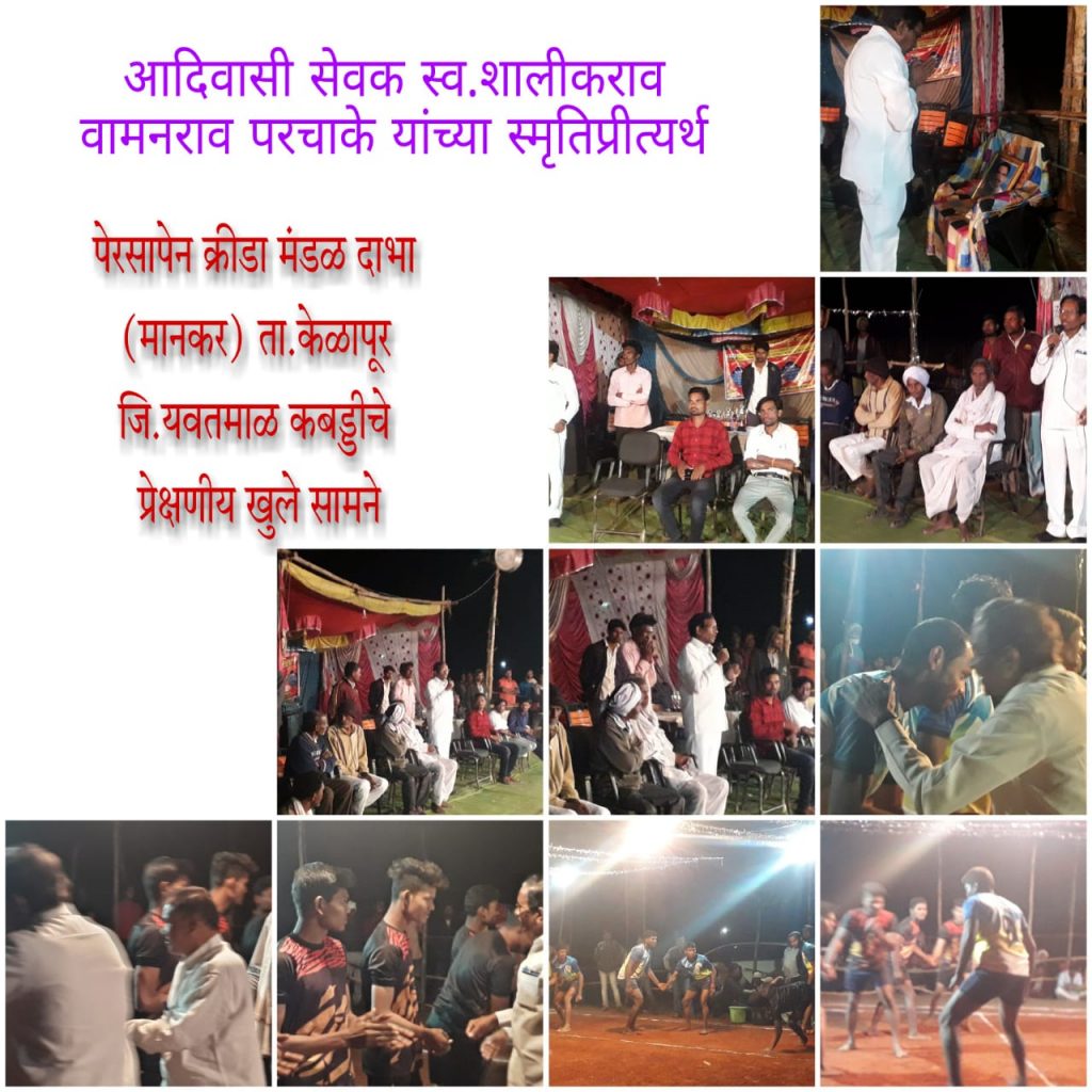 आदिवासी सेवक स्व.शालीकराव वामनराव परचाके यांच्या स्मृतीप्रीत्यर्थ जय पेरसापेन क्रीडा मंडळ दाभा ( मानकर) ता.केळापूर जि.यवतमाळ यांच्या वतीने आयोजित कबड्डी चे प्रेक्षणीय खुले सामने ..या सामन्याच्या ठिकाणी काल दि.२१-२-२०२२ रोजी भेट देऊन खेळाडूंना शुभेच्छा देताना माजी शिक्षणमंत्री प्रा.वसंत पुरके यावेळी माणीकराव परचाके ,सुरेशजी सावंत ,राजुभाऊ सराटे,रविभाऊ राठोड,संदीपजी कुडमते,सुभाष जी राठोड प्रामुख्याने उपस्थित होते.सामने यशस्वी करण्यासाठी नागोराव आत्राम, रविंद्र कुडमते,शेखर परचाके,रवि राठोड ,विजय राठोड, उत्तम परचाके, भानुदास परचाके, पुंडलिक मरापे, पुरूषोत्तम मरापे,रोशन कोडापे , अंकुश गेडाम परिश्रम घेत आहे.कार्यक्रमास गावकरी बंधू व भगिनी मोठ्या प्रमाणात उपस्थित होते.