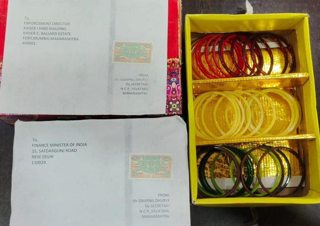 वणी दि 23-2,2022 रोजी राष्ट्रवादी काँग्रेस पक्षाचे चे नेते नवाब मलिक यांना ईडी कडून अटक करण्यात आली त्याचेच पडसाद वणी मध्ये पहायला मिळाले, वणी विभागातील युवकाच्या पुढाकारातून ईडी च्या अधिकाऱ्यांना बांगड्या चे डब्बे पोस्टा मार्फत यांचा अर्थ मंत्री भारत सरकार यांना पाठवुन निषेध आंदोलन करण्यात आले आहे. भारत सरकार चा वित्त विभागाच्या अधीनीस्त असलेली संस्था अंमलबजावणी संचालनालय (ई.डी) यांनी राजकीय द्वेषा पोटी नवाब मलिक यांचा वर अटकेची कार्यवाही केलेली आहे. हि कार्यवाही लोकशाही साठी घातक आहे, ईडी तील सनदी अधिकारी हे केन्द्र सरकार चे बाहुले झालेले आहे, आज पर्यंतच्या इतिहासा मध्ये अश्या कार्यवाही कधीच झालेली नाही.