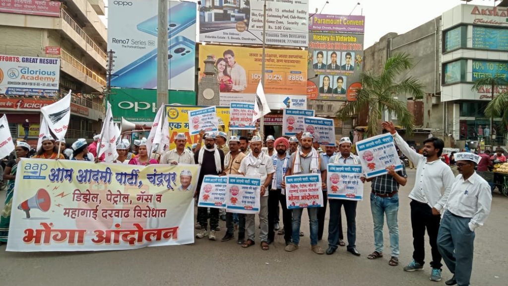 गोरगरीब जनता तर गॅस बंद करुण चुलीवर स्वयंपाक करायला भाग पाडाले आहे. याचा कुठेतरी विरोध व्हायला पहिजे म्हणून आज आम आदमी पार्टी कडून चंद्रपूर येथील गांधी चौकात महागाई विरोधात भोंगा आंदोलन करण्यात आले. यावेळी ऍड सुनिता पाटील महिला अध्यक्ष, विजय सिद्धावार जिल्हा उपाध्यक्ष, संतोष दोरखंडे जिल्हा सचिव, राजेश चेडगुलवार जिल्हा मीडिया हेड, शंकर धुमाळे ऑटो संघटन जिल्हाध्यक्ष , सुनील भोयर महानगर संघटन मंत्री, योगेश आपटे उपाध्यक्ष, राजकुमार कांबळे, संजय ब्राह्मणे, निलेश रामटेके, परमजीत सिंग झगडे, लक्ष्मण पाटील, गोपाल भूतडा, शबनम शेख, दिलेश पाटील, सुजाता बोडेले, आरती आगलावे, जास्मिन शेख, पवन वाघमारे, अनुप तेलतुंबडे, जय देवगडे, चंदू माडुरवार, आश्रफ सय्यद, ॲड प्रतिक विराणी, राजू चोरिया, बेबी बाई मुंगळे, दुर्गे डोंगरे, रूपा काटकर, मीना पोटफोडे, वदंना कुंदनवार, शुभद्रा मून, पूजा खोबरे, सपना वाघमारे, शर्मिना विश्वास, मधुकर साखरकर. इत्यादी अनेक कार्यकर्ते उपस्थीत होते.