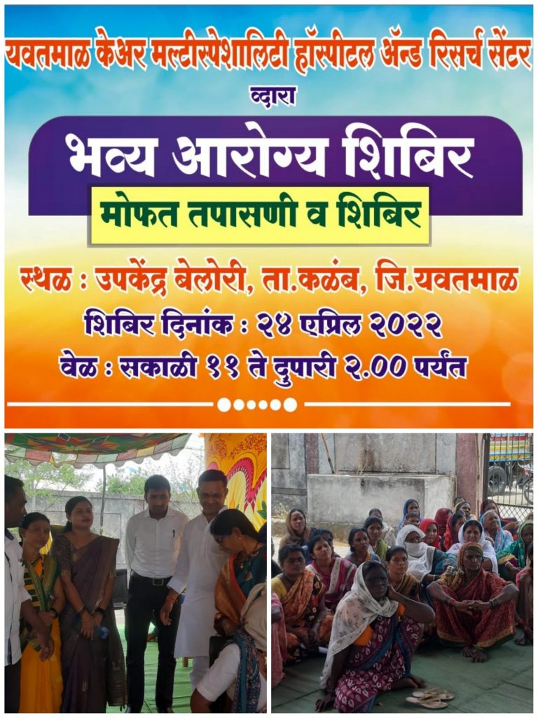 कळंब तालुक्यातील बेलोरी येथे आज दिनांक 24/4/2022 रोजी यवतमाळ केअर मल्टीस्पेशालिटी हॉस्पिटल ॳॅंड रिचर्स सेंटर द्वारा भव्य आरोग्य शिबीराचे आयोजन करण्यात आले होते.त्या शिबीराचे उद्घाटन यवतमाळ येथील प्रसिद्ध आरोग्य समाजसेवक श्री रितेशजी भरूट यांच्या हस्ते बेलोरी येथील सरपंच श्रीमती ईंदूबाई सर्वजित मस्के,तिलकराज गुगलिया,सौ.प्राची भरूट, प्रशांत घोडाम ग्राम पंचायत सदस्य,सौ.गीता विष्णू सोयाम, यांच्या उपस्थितीत करण्यात आले.त्या शिबीरात उपस्थित ॾॉ.प्रशांत तामगाडगे, डॉ वरूण डहाके, डॉ विनोद जाधव, डॉ सागर गोक्सूलवार, डॉ सचिन बन्सोड, डॉ सुमित गुरदे, डॉ अजोनिश कांबळे, यांनी अनेक आजारांवर आधारित तपासणी केली .त्यावेळी बेलोरी ग्रामपंचायतीच्या सरपंच श्रीमती ईंदूबाई सर्वजित मस्के , आरोग्य सेविका व उपस्थित मान्यवर यांच्या उपस्थितीत हा कार्यक्रम पार पडला.त्या कार्यक्रमाला ग्राम पंचायत सदस्य , ग्राम पंचायत सदस्य प्रशांत घोडाम,गांधीनगरचे पोलिस पाटील सचिन लिंगे, बेलोरी पोलिस पाटील,सौ. करूणा मस्के मॅडम, ग्राम पंचायत सचिव, जिल्हा परिषद सर्व शिक्षक, आरोग्य सेविका , तालुका कृषी अधिकारी मनोज पवार साहेब, उपस्थित होते.या कार्यक्रमांचे प्रास्ताविक विशाल मस्के सर यांनी केले तर प्रास्ताविक डुडुले सर यांनी केले तर चव्हाण सर यांनी आभार मानले.या आरोग्य शिबीरात परिसरातील अनेक लोकांनी आपली तपासणी करून लाभ घेतला.
