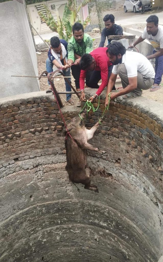 शनिवार दिनांक 4 6 2022 रोजी सकाळी सहा वाजता सुमारास गवळी लेआऊट उर्दु शाळेजवळ विहिरी मध्ये एक वन्यजीव पडला अशी माहिती देतील रहिवासी यांनी mh21 हेल्पिंग हॅन्ड्स चे तालुका अध्यक्ष संदीप लोहकरे यांना दिली असता त्यांनीही माहिती वन विभागाला कळविले वन विभागातील वनपाल देवकते साहेब आणि एम एच 29 चे सदस्य त्याठिकाणी पोहोचून त्या वन्यजीवास वाचवण्याचे प्रयत्न करू लागले अधिक माहिती घेतली असता त्या वन्य जीवाचा पाठलाग गावातील मोकाट कुत्रे करत होते असे समोर आले आणि तो वन्यजीव स्वतःचा जीव वाचवत विहरी मधे जाऊन पडला वन विभाग व एम एच 29 हेल्पीन्ग हॅन्ड्स वाईल्ड एडवेन्चर च्या मदतीने वन्यजीवास जीवन दान देण्यात आले तसेच या कार्यात राष्ट्रवादी काँग्रेसचे तालुकाध्यक्ष व नगरसेवक बाळू भाऊ धुमाळ यांनी खूप मदत झाली त्यांनी वेळेवर गावातील एक रेस्क्यू टीम तयार करून दिली व त्या वन्य जीवास जीवनदान देण्यात मदत केली अधिक माहिती देताना प्राणी मित्र संदीप लोहकरे सांगतात की हा प्राणी भारतीय रानटी डुक्कर वाइल्ड बोर असे म्हणतात सायंटिफिक नाव (सुस स्क्रोफा) हा जंगली प्राणी असून भारतातील जंगली प्रदेशातून सर्वत्र आढळतो हिमालया मध्ये चार ते पाच किमी उंचीपर्यंत त्याची वस्ती असते सर्वसाधारण एक ते पाच मी लांब 70 ते 90 सेंटिमीटर उंच व 140 किलोग्राम पेक्षा अधिक वजनाची ही वन्य जीव असतात असून ती चांगली चपळ व ती दहा ते वीस च्या कळपामध्ये भटकतात जीवनदान मिळालेल्यांना जीवाचं वजन 90 ते 100 किलोग्राम एवढं असावं असा अंदाज आहे त्या वन्यजीवाला वनविभागाचे वनपाल एम बी देवकते व एम एच 29 हेल्पिंग हँड्स चे तालुका अध्यक्ष संदीप लोहकरे व सदस्य आदेश आडे, सिद्धांत थुल, मोहन देवकर, राहुल चव्हाण यांच्या उपस्थितीत वनपरिक्षेत्रात सुखरूप सोडण्यात आले.