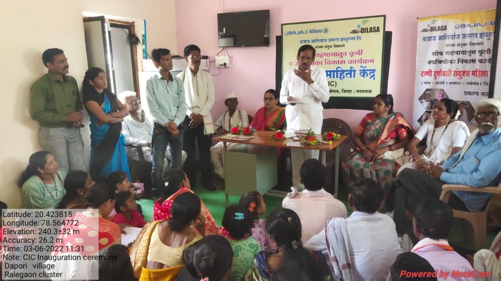 बजाज आलियांज जनरल इन्शुरन्स लि. व दिलासा संस्था घाटंजी यांच्या संयुक्त विद्यमाने राबविण्यात येणाऱ्या लोकसह्भागातून कृषी व उपजीविका विकास कार्यक्रम अंतर्गत तयार करण्यात आलेल्या दापोरी येथील सामुहिक माहिती केंद्राचे उदघाटन महाराष्ट्र राज्याचे माजी शिक्षण मंत्री तथा एकात्मिक आदिवासी विकास महामंडळाचे महाराष्ट्र राज्याचे उपाध्यक्ष वसंतराव जी पुरके सर यांच्या हस्ते करण्यात आले प्रसंगी यवतमाळ जिल्हा परिषदेच्या सदस्या उषाताई भोयर ग्रामपंचायत सरपंच प्रतिभा भगत, उपसरपंच तथा उक्तर्ष गाव विकास समिती चिकना चे अध्यक्ष नारायणरावजी इंगोले, ग्रामपंचायत सदस्य महादेव गेडाम ललिता नागोसे अध्यक्ष नवनिर्माण संयुक्त महिला समिती चिकना , सिमा तोडासे अध्यक्ष राणी दुर्गावती संयुक्त महिला समिती यांच्या उपस्थितीत करण्यात आला हा कार्यक्रम राळेंगाव तालुक्यातील लोहारा, एकलारा, कृष्णापूर, श्रीरामपूर, शिवरा, मांडवा, पिंपरी दुर्ग, सोयटी, कोपरी, इंझापूर वालधुर, चिकना व दापोरी अशा एकूण 13 गावांची निवड केली असून, प्रत्येक गावामध्ये ग्रामस्तरावर गाव विकास समिती व महिला समितीच्या माध्यमातून