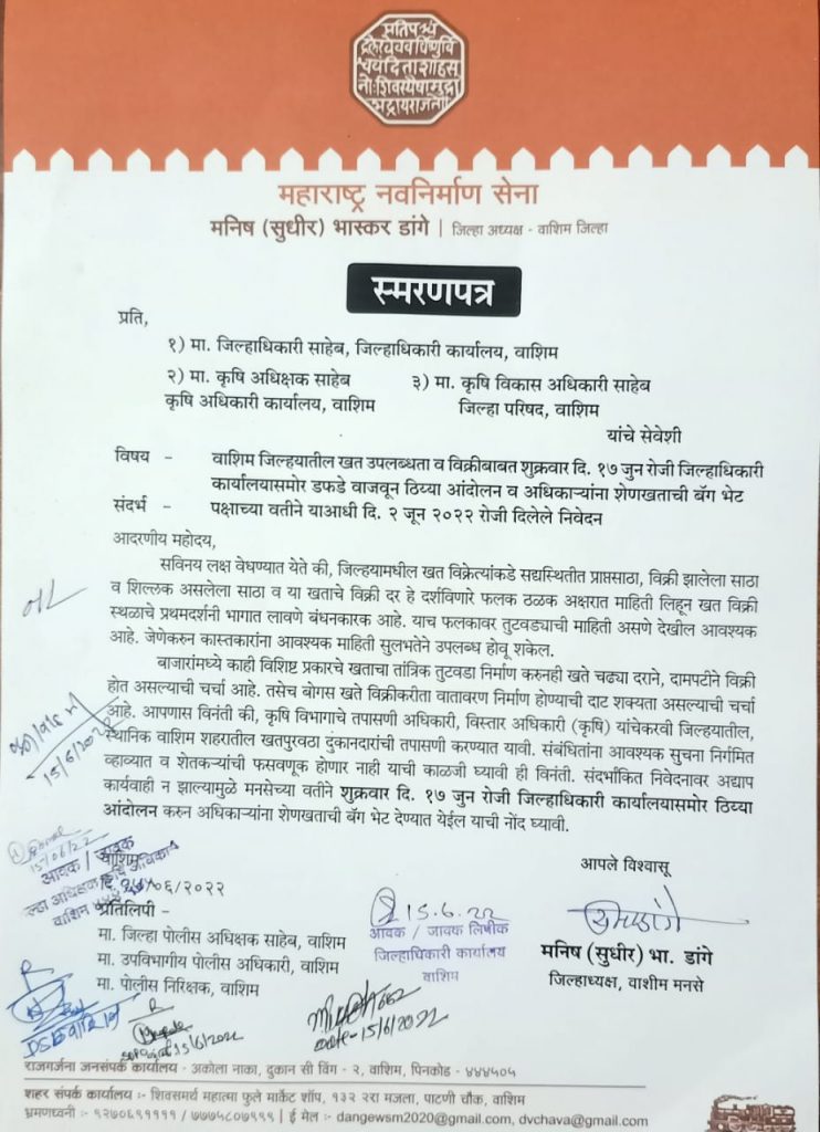 दिलेल्या निवेदनात नमूद आहे की, जिल्हयामधील खत विक्रेत्यांकडे सद्यस्थितीत प्राप्तसाठा, विक्री झालेला साठा व शिल्लक असलेला साठा व या खताचे विक्री दर हे दर्शविणारे फलक ठळक अक्षरात माहिती लिहून खत विक्री स्थळाचे प्रथमदर्शनी भागात लावणे बंधनकारक आहे. याच फलकावर तुटवड्याची माहिती असणे देखील आवश्यक आहे. जेणेकरुन कास्तकारांना आवश्यक माहिती सुलभतेने उपलब्ध होवू शकेल. बाजारांमध्ये काही विशिष्ट प्रकारचे खताचा तांत्रिक तुटवडा निर्माण करुनही खते चढ्या दराने, दामपटीने विक्री होत असल्याची चर्चा आहे. तसेच बोगस खते विक्रीकरीता वातावरण निर्माण होण्याची दाट शक्यता असल्याची चर्चा आहे. यासंदर्भात कृषि विभागाचे तपासणी अधिकारी, विस्तार अधिकारी (कृषि) यांचेकरवी जिल्हयातील, स्थानिक वाशिम शहरातील खतपुरवठा दुकानदारांची तपासणी करण्यात यावी. संबंधितांना आवश्यक सुचना निर्गमित व्हाव्यात व शेतकर्यांची फसवणूक होणार नाही याची काळजी घ्यावी अशी मागणी २ जून रोजी पक्षाच्या वतीने दिलेल्या निवेदनाव्दारे करण्यात आली होती. मात्र निवेदनावर कृषी विभागाने कोणतीही कार्यवाही न झाल्यामुळे मनसेच्या वतीने जिल्हाधिकारी कार्यालयासमोर ठिय्या आंदोलन करुन अधिकार्यांना शेणखताची बॅग भेट देणार असल्याचे नमूद केले आहे. तरी या आंदोलनात मनसेचे पदाधिकारी व कार्यकर्त्यांनी सहभागी होण्याचे आवाहन जिल्हाध्यक्ष मनिष डांगे यांच्यासह मनसे जिल्हा उपाध्यक्ष संतोष इंगोले, तालुकाध्यक्ष मोहन कोल्हे, उपाध्यक्ष विठ्ठल राठोड, किशोर गजरे, शेतकरी सेनेचे तालुकाध्यक्ष रघुनाथ खुपसे, वाशीम शहराध्यक्ष कृष्णा इंगळे, उपाध्यक्ष गणेश इंगोले, प्रतिक कांबळे, सचिव प्रकाश कवडे, महिला सेना जिल्हाध्यक्ष सीता धंदरे, उपाध्यक्ष रंजना राठोड, सचिव स्मिता जोशी, शहर उपाध्यक्ष सौ. वंदना अक्कर, मालेगाव शहराध्यक्ष बेबी कोरडे, तालुका उपाध्यक्ष वनिता पांडे, प्रमिला इंगळे, अर्चना इंगळे, प्रमिला थोरात, जिल्हा उपाध्यक्ष केशव गरकळ, संतोष इंगोले, जिल्हा सचिव सतिश कडवे, रिसोड तालुकाध्यक्ष दिपक वाघ, शहराध्यक्ष संजय येवले, उपाध्यक्ष संतोष पौळ, रवि सुरुशे, लक्ष्मण वानखेडे, सचिव धनिराम बाजड, उपाध्यक्ष अमोल तुरेराव, मालेगाव तालुकाध्यक्ष ज्ञानेश्वर गवळी, शहराध्यक्ष विक्की वर्मा, उपाध्यक्ष गजानन कुटे, उपाध्यक्ष विनोद वानखेडे, सचिव रितेश राठोड, मुंगळा सर्कल अध्यक्ष सुनिल शेंडगे, डोंगरकीन्ही सर्कल अध्यक्ष आकाश कुटे, उपाध्यक्ष आतिष डहाळे, उपाध्यक्ष आकाश राठोड, सचिव गोविंद अहिर, वाशिम तालुकाध्यक्ष मोहन कोल्हे, शहराध्यक्ष कृष्णा इंगळे, उपाध्यक्ष विठ्ठल राठोड, उद्धव ढेकळे, किशोर गजरे, शहर उपाध्यक्ष प्रतिक कांबळे, गणेश इंगोले, सचिव 