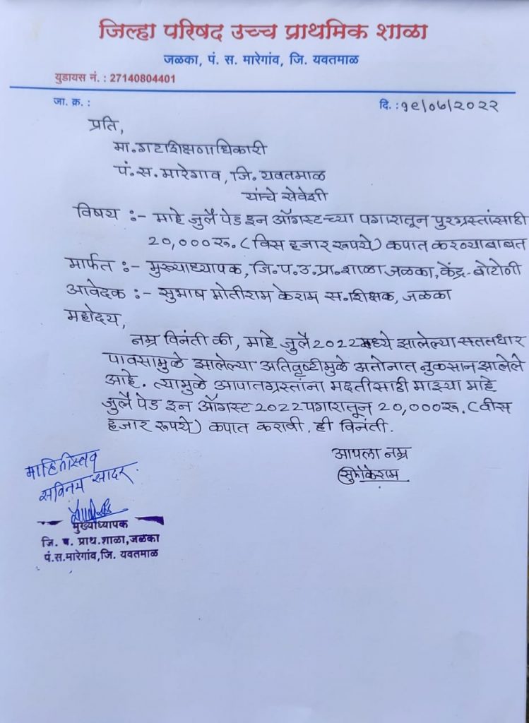 दि.१८ जुलै २०२२ ला आलेला महापूर तसेच संततधार मुसळधार पावसामुळे आलेला महापूर आणि अतिवृष्टीमुळे शेतकऱ्यांच्या पिकाचे झालेले नुकसान तथा हानीमुळे संपूर्ण यवतमाळ जिल्ह्यातील नागरिक व शेतकऱ्यांची खूप मोठी हानी झाली. अनेक पूरपिडीत गावांना हलविण्यात आले, उभे पीक नेस्तनाबूत झालेले पाहून एक संवेदनशील असलेल्या जि. प. उच्च प्राथमिक शाळा धानोरा पं. स. राळेगाव येथून शिक्षकी पैशाची कारकीर्द सुरू करणारे सहाय्यक शिक्षक सुभाष मोतीराम केराम यांनी जुलै पेड ईन२०२२ ऑगस्ट २०२२ च्या मिळणाऱ्या पगारातून २० हजार रुपये पुराग्रस्त तथा शेतकऱ्यांच्या मदतीला देण्याचे पत्र मा. गटशिक्षणाधिकारी पंचायत समिती शिक्षण विभाग मारेगाव येथे देऊन समाजात मानवतेचा संदेश कृतीतून निर्माण केला आहे, सध्या मुसळधार पाऊस आणि महापूर यामुळे राज्यातील शेतकरी अस्मानी,सुलतानी संकटात सापडला आहे.परंतू या जगाच्या पोशिंद्याच्या मदतीला अजून ठोस पणे कोणीही समोर आले नाही. राज्य शासनाने मदत देण्याचे आश्वासन दिले आहे, परंतू वडकी ता. राळेगाव येथील मुळ रहिवासी असलेले सध्या मारेगाव तालुक्यातील जिल्हा परिषद उच्च प्राथमिक शाळा जळका पं. स. मारेगाव या शाळेचे संवेदनशील शिक्षक सुभाष मोतीराम केराम यांनी दरमहा वेतन काढणाऱ्या पं.स.च्या शिक्षण विभागाला पत्र देऊन जुलैच्या पगारातून २० हजार रुपये पूरग्रस्त शेतकऱ्यांच्या मदतीसाठी मुख्यमंत्री सहायता निधीत जमा करावे अशी विनंती केली आहे, विद्यार्थ्यांना ज्ञानाचे धडे देत असतानाच कृतीतून आदर्श निर्माण करणाऱ्या सुभाष मोतीराम केराम या मानवतावादी शिक्षकांचे संपूर्ण राळेगाव तालुक्यात कौतुक तर होत आहेच सोबतच अभिनंदन व भरभरून शुभेच्छा दिल्या जात आहे, विशेष म्हणजे दिनांक २४/०१/२००५ ला जि. प. उच्च प्राथमिक शाळा किन्ही जवादे ता. राळेगाव येथे कार्यरत असताना सुभाष मोतीराम केराम यांनी सेन्ट्रल बॅंक ऑफ इंडिया शाखा वडकी मार्फत ५०००रु.(पाच हजार रुपये) त्सुनामी काळात पंतप्रधान सहायता निधीत जमा केलेले आहे.कोरोना काळात अनेक कोरोना ग्रस्त रूग्णाला स्वतःच्या फोर व्हीलर गाडीने रूग्णालयापर्यंत पोहचवण्यात मदत केली तसेच सर्व सोई सुविधा बंद असल्या कारणाने बाहेरगावाहून कोरोना बंदोबस्तासाठी आलेल्या पोलीस बांधवांची घरून चाय व नास्त्याची संपूर्ण काळ सेवा दिली तसेच गावात भटकणाऱ्या पागल व्यक्तींना घरून जेवनाची व्यवस्था केली.विशेष म्हणजे इतरांच्या अडचणीत स्वतःहून मदत करण्याची सेवाभावी वृत्ती असलेले पण प्रसिद्ध पासून दूर असलेले आमचे आदरणीय गुरूजी सुभाष मोतीराम केराम.