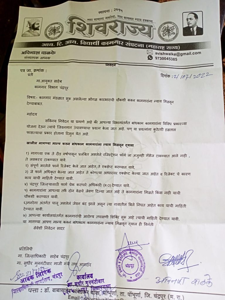 संपूर्ण भरलेले फार्म रिजेक्ट केले जात आहेत, ते एक्सेप्ट करण्यात यावे, चंद्रपूर जिल्ह्यासाठी फार्म चेक करणारे अधिकारी (R O) देण्यात यावे.कामगारांना जेवण मिळते कि नाही याची चौकशी करण्यात यावी. मनरेगा अंतर्गत चालू असलेलं जेवन बंद झाले असून त्या गावातील बिले निघत आहेत काय याची चौकशी करण्यात यावी. आरोग्य तपासणी चा लाभ खरच कामगारांना होत आहे का याची चौकशी करण्यात यावी यासर्व मागण्या समस्या सोडविण्यात यावा अशी मागणी शिवराज्य आयटिआय विद्यार्थी कामगार संघटनेने निवेदनात केली आहे.