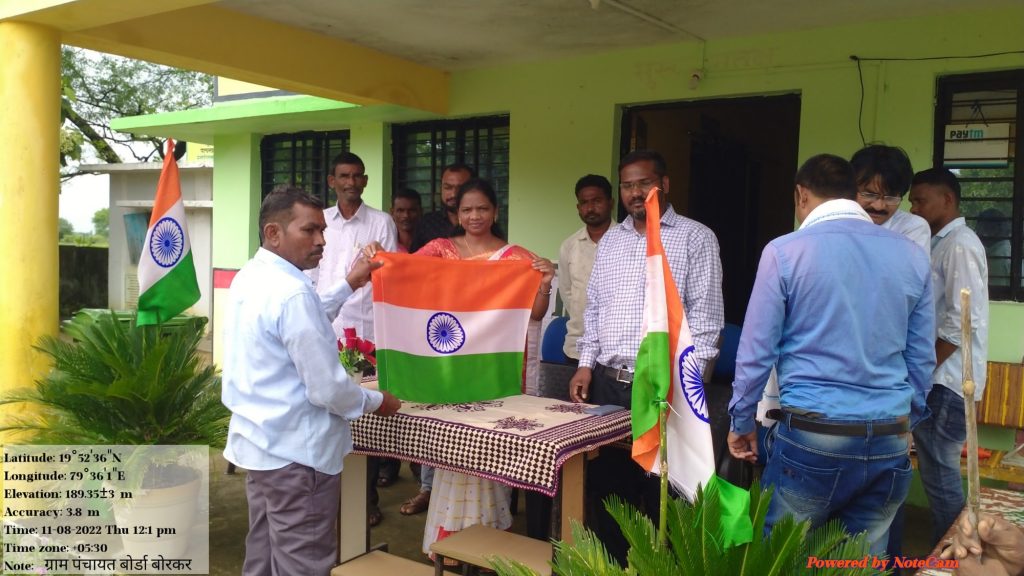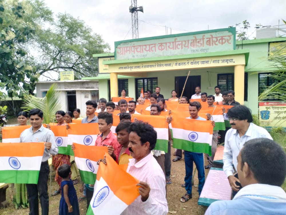 स्वातंत्र्याचा पंच्याहत्तरवा अमृत महोत्सव प्रत्येक घरावर तिरंगा लाऊन साजरा करन्याचा संकल्प केंद्र व राज्य सरकारने घेतला असून यात संपूर्ण देशवासीयांनी सहभाग घ्यावा यासाठी हर घर तिरंगा अभीयान विविध माध्यमातून जनजागृती केल्या जात आहे अशातच ग्रामीण भागातील नागरीकांना राष्ट्रध्वज सहज उपलब्ध व्हावे यासाठी शासनानी प्रत्येक ग्राम पंचायतला राष्ट्रध्वज उपलब्ध करून दिले सदर राष्ट्रध्वज तेरा आगष्ट ते पंधरा आगष्ट दरम्यान प्रत्येक घरावर लावायचे असल्याने बोर्डा बोरकर ग्राम पंचायत च्या माध्यमातून आज दिनांक ११/०८/२०२२ रोजी राष्ट्रध्वज वितरीत करण्यात आले यावेळेस पोंभूर्णा पंचायत समतीचे बि.डि.ओ. श्री.वाळवी साहेब संवर्ग विकास अधिकारी श्री. कुझैकर साहेब,पंचायत समिती च्या माजी सभापती कु. अल्काताई ,सचिव श्री.किशोर ठेंगणे साहेब,सरपंच श्री.बालाजी नैताम,उपसरपंच महेश कोसरे,अंगणवाडी सेविका,आशावर्कर, ग्रा.पं.सदस्य बालचंद कुळमेथे ,सामाजिक कार्यकर्ते आशिष नैताम,संगणक परीचालक दिपक कुनघाडकर, ग्रा.पं.शिपाई उमेश सिडाम,रविंद्र भट व गावातील नागरीक मोठ्या संख्येने उपस्थित होते….