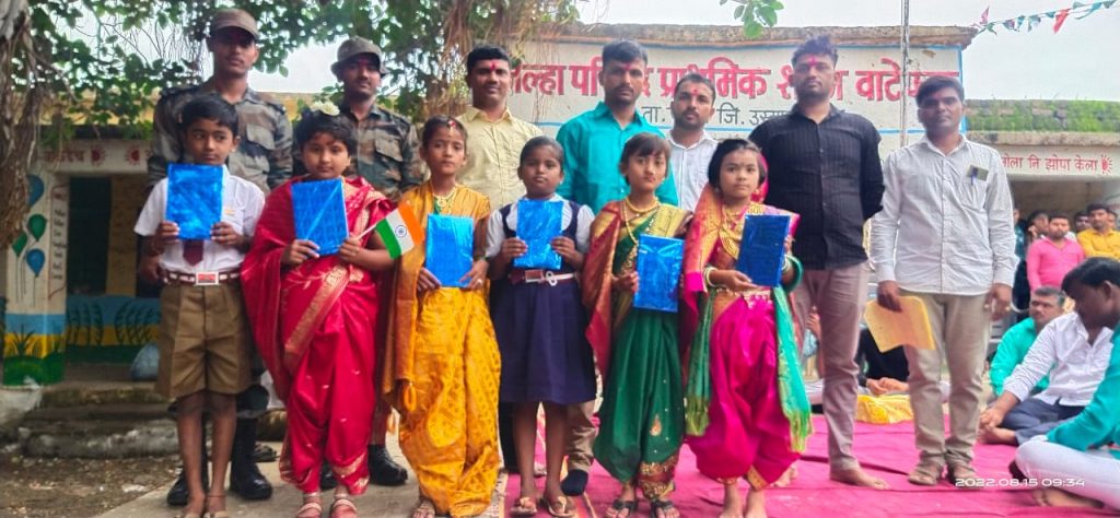 संपूर्ण भारतभर उत्साहात साजरा होत असलेले 2022 हे वर्ष अमृत महोत्सवी वर्ष म्हणून साजरे होत आहे अमृत महोत्सवी दिनाचे औचित्य साधून वाटेफळ येथील देश सेवेमध्ये भारतीय सैन्यदल ,नौदल पोलीस मित्र परिवारांच्या वतीने जिल्हा परिषद प्राथमिक शाळा येथील गुणानुक्रमे शालेय विद्यार्थ्यांना डिजिटल पॅडसह खाऊचे वाटप लष्करातील जवानांचे हस्ते करण्यात आले, तसेच बालाजी एंटरप्राइजेस अँड वेल्ड व जय हनुमान माध्यमिक व उच्च माध्यमिक विद्यालय वाटेफळ यांच्या संयुक्त विद्यमानाने भारतीय सैन्यदल पोलीस दलातील उपस्थित जवानांचा शाल श्रीफळ फेटा बांधून सन्मान करण्यात आला.