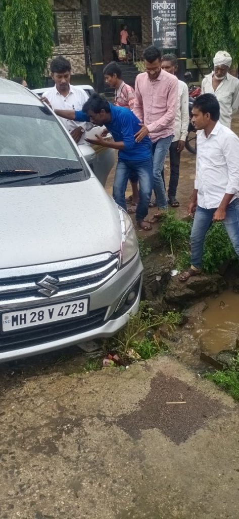 विविध कार्यकारी सोसायटी समोर अरुंद अवस्थेत असलेल्या नादुरुस्त पुलामुळे डॉक्टर कवडे साहेब यांच्या हॉस्पिटलमध्ये आपली चार चाकी घेऊन उपचारासाठी आलेल्या एका परिवाराचा नागरिकाच्या सतर्कतेमुळे मोठा अपघात होता होता वाचला उपचारासाठी आलेल्या चार चाकी च्या चालकाला नादुरुस्त असलेल्या पुलाचा अंदाज न आल्यामुळे गाडीचे एक चाक नालीच्या खड्ड्यामध्ये गेले ही बाब तिथे उपस्थित असलेल्या नागरिकांना लक्षात आल्यावर पडत्या पाण्यात त्या ठिकाणी ताबडतोब धावत जात एका बाजूने गाडी उचलून पकडत गाडी खड्ड्यातून काढण्यात मदत केली, नागरिकांच्या सतरतेमुळे अख्खी गाडी खड्ड्यात जाता जाता राहिली आणि मोठा अपघात होता होता टळला यावेळी संभाजी गोरटकर युवा सेना तालुकाप्रमुख, सय्यद माजीद सय्यद पाशा प्रहार तालुकाप्रमुख, जॉन्टी विणकरे , वंचित बहुजन आघाडी जिल्हा महासचिव, यांनी सदर गाडी खड्ड्यातून बाहेर काढण्यास मदत केली.मानवतेचे उत्तम उदाहरण व एकीच्या बळाचे महत्त्व काय असते हे कळले.