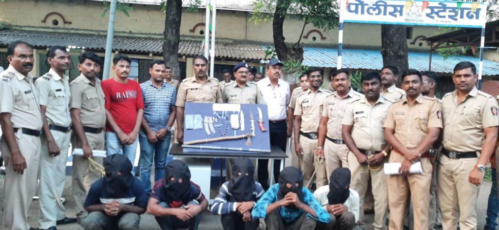 बिटरगांव पोलीस स्टेशन हद्दीत मागील काही दिवसापासुन घरफोडीच्या गुन्हयामध्ये वाढ झाल्यामुळे सदर चे गुन्हे उघडकीय आणण्यासाठी पोलीस स्टेशन बिटरगांव चे अधिकारी हे यांना गुन्हे उघडकीस आणने बाबत वरीष्ठांणी सुचना दिल्या होत्या . त्या अनुषंगाने पोलीस स्टेशन बिटरगांव चे ठाणेदार प्रताप दत्तात्रय भोस व त्यांचे कर्मचारी हे वरिष्ठांनी दिलेल्या सूचनेप्रमाणे घरफोडी चे गुन्हे उघडकीस आणण्या करीता कसोसीने प्रयत्न करीत होते . दि .२७ / ० ९ / २०२२ रोजी शेख शबिर शेख हनिफ वय ३५ वर्ष रा . बिटरगाव यांचे घरी दि .२७ / ० ९ / २०२२ रोजी चे रात्री ०१/०० वा घराचा कोंडा तोडुन सात दरोडेखोरांनी घरात प्रवेश करूण रॉड व कु – हाडीने वार करून जीव घेणा हल्ला करूण फिर्यादीला जखमी केले तसेच घरातील दागदागीने व त्यांच्या पत्नीच्या गळयातील असा एकुण ५४,००० / रू चा मुददेमाल बळजबरीने हीसकावुन घेवुन पळुन गेले . तसेच बिटरगांवातील राजु गुलाबराव देवकते यांचे १५०० / रू , शेख सुफीया शे मुसा यांचे गुळयातील सोन्याची पोत अंदाजे ३५००० / रू , संजय गंगाराम बुटले यांचे १००० / रू व हनुमान मंदीर येथील दानपेटी फोडुन ३००० / रू असे एकुन ९ ४,५०० / रू मुदेमाल जबरीने चोरून नेले तसेच वनविभाग जेवली रोड येथे कर्तव्यावर हजर असलेले वनविभागाचे कर्मचारी राजु देवकते यांचेवर दगडफेक करून यांचे सरकारी कामकाजात अडथळा निर्माण केला व सरकारी वनविभागाचे पोस्टची तोडफोड करून सरकारी मालत्तेचे ५०,००० / रू चे नुकसान केले आहे . यानी लागलीच माहीती वरिष्ठांना देवुन त्यांचे स्टॉफ सह बिटरगांव येथे येवुन लागलीच • पोलीस स्टेशन बिटरगांव येथील स्टॉफ यांची गांजेगाव पुल व पिपंळगाव पुल येथे नाकाबंदी लावण्यात आली . व सापळा रचण्यात आला . घरफोडी करणारे ७ इसम हे घरफोडी करून पैदल येताना पिपंळगाव पुल येथे दिसताच दबा धरून बसलेल्या पोलीसानी त्यांचेवर झडप टाकली . त्यामधील इसमा कडे कु – हाड , चाकु , लोंखडी रॉड व दगड होते . त्यांनी पोलीसावर हमला करण्याचा प्रयत्न केला असता पोलीसानी हमला चुकवुन ५ ते ७ आरोपी मधील ३ आरोपीना बिटरगाव व पिपंळगाव येथील पोलीस मित्र यांचे मदतिने जागीच पकडले व ४ आरोपी हे पळुण गेले . पळुन गेलेल्या आरोपी शोध कामी दोन पथके नेमुण एक पथक गांजेगावकडे व एक पथक जेवली पिपंळगाव येथे रवाना केले . गांजेगावकडील पथकानी गांजेगाव येथील पोलीस मित्र यांचे मदतीने दोन आरोपी पकडले . त्या आरोपीचे नावे पुढील प्रमाणे १ ) जाकी बावाजी चव्हाण वय २८ वर्षे रा . सोनारी ता . हीमायतनगर जि.नांदेड २ ) मांगीलाल श्रीरंग राठोड वय ३८ वर्षे रा . हीमायतनगर जि.नांदेड ३ ) विकास श्रीरंग राठोड वय २२ वर्षे रा . हीमायतनगर जि.नांदेड ४ ) निलेश गब्बरसीगं राठोड वय २२ वर्षे रा हदगाव जि.नांदेड ५ ) दत्ता मां