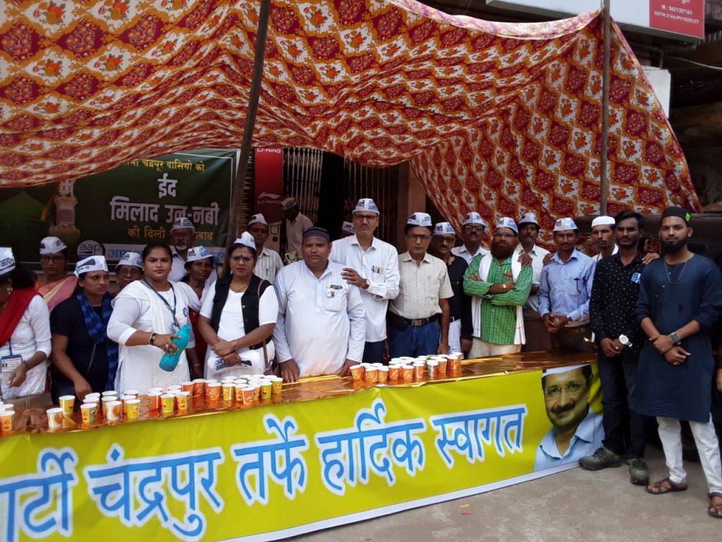 रविवार दिनांक 9 ऑक्टोंबर रोजी मोहम्मद पैगंबर यांचा जन्मदिवस या निमित्य आम आदमी पार्टी चंद्रपूर तर्फे जिल्हा अध्यक्ष सुनील मुसळे आणि महिला शहर अध्यक्षा एड. सुनीता पाटील यांच्या नेतृत्वात व जिल्हा कोषाध्यक्ष भीवराज सोनी, झोन 3 संयोजक रहेमान खान जी.पठाण, संस्थापक सदस्य सय्यद अश्रफ अली, यांच्या मार्गदर्शनात चंद्रपूर शहरातील सर्व मुस्लिम बांधवांना व येणाऱ्या रैली ला शुभेच्छा देत त्यांचे स्वागत करण्यात आले आणि शरबत वाटप करण्यात आले. सदर कार्यक्रमात युथ जिलाध्यक्ष मयुर राईकवार, महिला उपाध्यक्षा रुपाताई काटकर, महिला संघटन मंत्री आरती आगलावे, कार्यकारी अध्यक्ष शबनम शेख, उपाध्यक्षा जस्मिन शेख, ऑटो जिल्हा अध्यक्ष शंकर धुमाळ, ऑटो संघटन मंत्री विनोद रेब्बावार, झोन क्र 2 अध्यक्ष राजू भाई चौरिया, डॉ. सलीम तुकडी, श्री मनोहर पाटील, महानगर संघटन मंत्री सुनील भोयर, युवा शहर अध्यक्ष संतोष बोपचे, कृष्णाजी सहारे, अजय डुकरे, शहर उपाध्यक्ष सिकंदर सगोरे, वंदना कुंदावर ताई, झोन 3 महिला अध्यक्षा, ममता गणवीर, तरणुम मॅडम, शिल्पा कांबळे, बेबीताई मुंगळे, अध्यक्ष झोन 1 सुनील सदभैया, खालिद शेख, सर्फराज भाई, दीलेश पाटील, राजकुमार कांबळे, डी.एस. दुधे, मुन्ना तिवारी, सर्फराज, सय्यद उस्मान, सय्यद फारुख, शाबज भाई, इम्रान शेख, अमर मेंढे, सुशील वाहिले, डॉ.देवेंद्र अहिर, रोशन बोरकर, सिद्धार्थ येले, सुभाष दुर्योधन, सुहानी दूरयोधन, गोकुळ बनसोड, पोटे काका, महेश भाई बुटले ,सैदुल भाई, मौलाना फारुख भाई ,उस्मान भाई, शोयेल पटेल इत्यादि अनेक कार्यकर्ते पदाधिकारी उपस्थित होते शुभेच्छा देत शरबत वाटप करण्यात सर्वांचे मोलाचे योगदान लाभले.