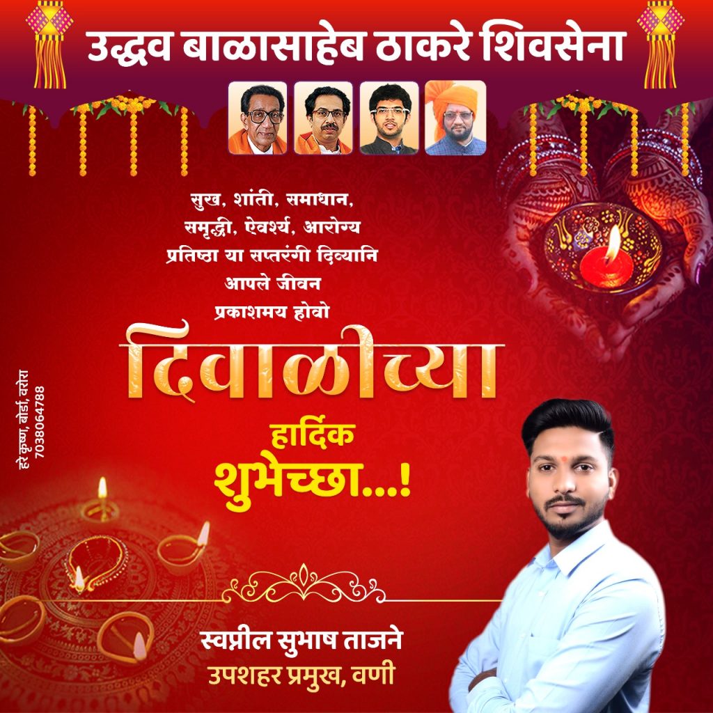 वणी तालुक्यातील समस्त जनतेला दिवाळीच्या हार्दिक शुभेच्छा,शुभेच्छुक:स्वप्नील सुभाष ताजने,उपशहर प्रमुख ,शिवसेना वणी