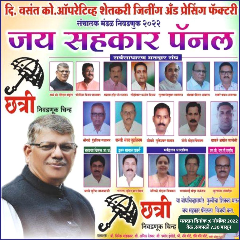 वसंत को. ऑपेरेटिव्ह शेतकरी जिनिंग अँड प्रेसिंग संचालक मंडळ निवडणुकीत छत्री या बोधचिन्ह दाबून जय सहकार पॅनल ला प्रचंड बहुमतांनी विजयी करा.