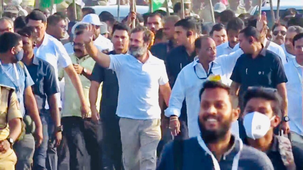 पदयात्रे दरम्यान राहुल गांधी यांच्या गळ्यामध्ये सुतीहार टाकून त्यांचे माजी आमदार प्रा.राजू तिमांडे यांनी स्वागत केले व पदयात्रेमध्ये सहभागी होऊन पायी चालता चालता त्यांच्याशी संवाद केला तसेच नगरसेवक सौरभ तिमांडे यांनी राहुल गांधी यांना छत्रपती शिवाजी महाराजांची प्रतिमा भेट दिली त्यावेळी त्यांच्या चेहऱ्यावर स्मितहास्याने आभार मानले .याबाबत सविस्तर वर असे की भारतात ०७ सप्टेंबर पासून सुरू झालेल्या या भारत जोडो पदयात्रा केरळ,तामिळनाडू,कर्नाटका, तेलंगणा आंध्र प्रदेश इत्यादी राज्यातून असा प्रवास करत महाराष्ट्रात दाखल झाली आहे. एकजुटीने भारत जोडो यात्रेमध्ये देशातील द्वेष आणि क्रोध संपण्यासाठी देशातील पुरोगामी विचारांच्या संघटना व मित्र पक्षांचा मोठा पाठिंबा लाभत आहे तसेच निघालेला पदयात्रेत विद्यार्थी,युवक,तरुण पिढ, मुली,महिला व नागरिक मोठ्या संख्येने हातात तिरंगा ध्वज घेऊन सहभागी होत आहे. या यात्रेला प्रचंड असा प्रतिसाद मिळत असून यात्रेत सहभागी होणाऱ्या नागरिकांची संख्या पन्नास हजारा पासून दीड ते दोन लाखापर्यंत आहे.देशात चैतन्यमय वातावरण निर्माण होत आहे. आजपर्यंत तीन हजारच्या किलोमीटरच्या वर पायी प्रवास झाला आहे ही पदयात्रा जगाच्या पाठीवर आतापर्यंत काढलेली नाही ही पदयात्रा आता महाराष्ट्रातील ३८१ किलोमीटरचा प्रवास करत मध्यप्रदेशच्या दिशेने जात आहे.