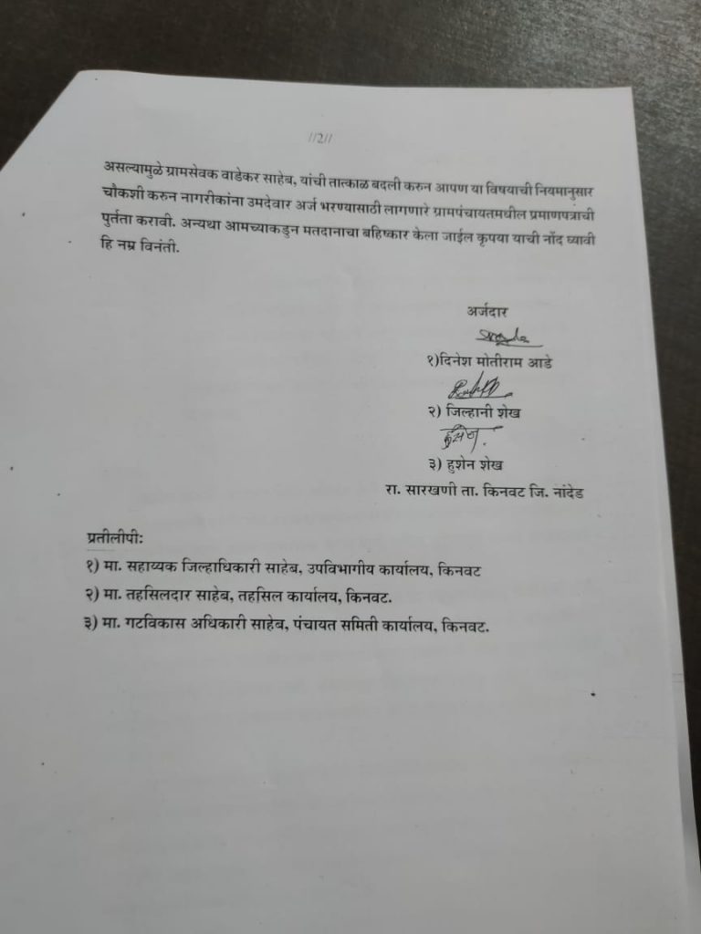 नवीन उम्मेदवार यांच्या अपेक्षेस तडा देण्यास ग्रामसेवक वाडेकर यांच्या कडून पदाचा गैर वापर होत असल्याची लेखी तक्रार वरिष्ठ अधिकारी यांना दिली होती सदरील तक्रारीमध्ये संबंधित ग्रामसेवक यांच्या वरती कार्यवाही न केल्यास मतदानाचा बहिष्कार केला जाईल असे सूचक विधान देऊन सुद्धा तक्रारी वर कार्यवाही झाली नसल्याने नवीन इच्छुक उमेदवार यांनी प्रशासकीय व्यवस्थेला कंटाळून सामूहिक आत्मदहन करण्याचा निर्णय
