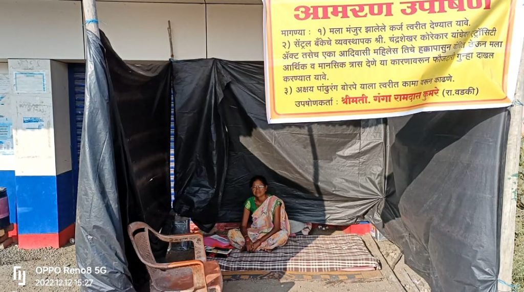 राळेगाव तालुक्यातील वडकी येथे सेंट्रल बँक समोर वडकी येथील गंगा रामदास कुमरे (४५) या महीलेला सि.एम.ई.जि. पी. ( मुख्यमंत्री रोजगार निर्मिती कार्यक्रम) या योजने अंतर्गत जिल्हा उद्योग केंद्रा व्दारे जिल्हाधिकारी यांचेकडुन मंजुर करुन सेंट्रल बँक शाखा वडकी ला कर्ज देण्यास मंजुरी दिली. परंतु शाखा व्यवस्थापक यांनी आम्हाला कुठलेही याबाबबत पत्र आलेले नाही असे सांगितले. त्यामुळे यवतमाळला तक्रार निवारण सभेत कर्ज देण्याचा आदेश करुन सुद्धा मला जातीय द्वेषापोटी आज पर्यंत कर्ज दिलेले नाही. यामुळे बँक व्यवस्थापक वडकी यांचेकडून शासनाच्या महिला सक्षमीकरण धोरणाला हरताळ फासला जात असून यामुळे उपोषण कर्त्या महिलेस मानसिक व आर्थिक त्रास सहन करावा लागत आहे. त्यामुळे दि. १२ डिसेंबर पासुन वडकी सेंट्रल बँकेसमोर आमरण उपोषण सुरु केले असून मला मंजूर झालेले कर्ज त्वरित देण्यात यावे व सेंट्रल बँक वडकीचे व्यवस्थापक चंद्रशेखर कोरेकार यांचेवर आदिवासी महिलेस तिचे हक्कापासून वंचीत ठेवून मला आर्थिक व मानसिक त्रास देणे या कारणावरुन फौजदारी गुन्हा दाखल करण्यात यावा. ही मागणी घेऊन वडकी येथील गंगा रामदास कुमरे यांनी सेंट्रल बँकेसमोर आमरण उपोषण सुरु केले आहे. जर उपोषण दरम्यान मला अथवा माझ्या कुटुंबातील कोणत्याही व्यक्तीस काही घडल्यास याला सेंट्रल बँकेचे व्यवस्थापक चंद्रशेखर कोरेकार हे व प्रशासन जबाबदार राहील असे उपोषण कर्त्या महिलेने लेखी निवेदनाद्वारे सांगितले आहे.