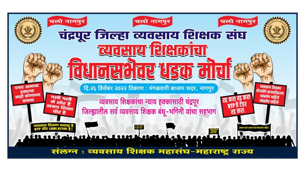राज्यात समग्र शिक्षा अंतर्गत व्यवसाय शिक्षण योजना राबविण्यात येत आहे. सदर योजनेची अंमलबजावणी व सनियंत्रणाची जवाबदारी असलेल्या समग्र कार्यालयामार्फत हि योजना शासनामार्फत पूर्णपणे अंमलबजावणी न करता महाराष्ट्रद्वेशी राज्याबाहेरच्या विविध खाजगी कंपन्या व त्रयस्थ संस्था यांच्या मार्फत कंपन्यांना निव्वळ नफा कमविण्याच्या उद्देशाने राबवण्यात येत आहेत, याचा परिणाम राज्यातील गरीब, अतिदुर्बल व वंचित आदिवासीविद्यार्थ्यांच्या कौशल्याभिमुख व्यवसाय शिक्षणाचा दर्जा व गुणवत्ता ढासळली आहे. खाजगी कंपन्या व त्रयस्थ संस्था यांच्या समग्र शिक्षा मधील अधिकाऱ्याशी असलेले लागे बांधे व आर्थिक हितसंबध याचा व्यवसाय शिक्षण व्यवस्थेवर मोठा नकारात्मक परिणाम होत आहे. समग्र शिक्षा कार्यालयाच्या बाजारीकरण धोरणामुळे राज्यात शासकीय शाळेत माध्यमिक वर्गाना व्यवसाय शिक्षण देणाऱ्या शिक्षकांना अनेक अडचणीचा सामना करावा लागतोय, परिणामी त्यांचे पगार, मासिक देयके तसेच विविध प्रात्यक्षिक खर्च सुद्धा गेल्या अनेक दिवसापासून रखडले आहेत. विद्यार्थी हा केंद्रबिंदू मानून येणारी पिढी सक्षम आणि स्वयंपूर्ण बनवणाऱ्या व्यवसाय शिक्षकांवर सध्या उपासमारीची वेळ आली आहे. शिक्षणावर राज्याचे मोठे आर्थिक बजेट खर्च केले जाते परंतु नेमका हा पैसा जातो कोठे ? या प्रश्नाला अनुसरून अनेक वेळा समग्र शिक्षा, मुख्यमंत्री व शिक्षणमंत्री यांना पत्रव्यवहार करूनही या ज्वलंत प्रश्नांना केराची टोपली दाखवली आहे, त्याचा जाब विचारण्यासाठी येत्या २६ डिसेंबर रोजी राज्याचे व्यवसाय शिक्षक संघटनेचे अध्यक्ष शोभराज खोंडे व नागपूर विभागीय सचिव प्रफुल मुने तसेच चंद्रपूर जिल्ह्याचे जिल्हाध्यक्ष आशिष राजनहिरे, कोषाध्यक्ष मयूर कश्यप यांच्या मार्गदर्शनाने जिल्यातील तमाम व्यवसाय शिक्षकांचा महामोर्चा विधान भवन नागपूर येथे होणार आहे आणि आपल्या न्याय हक्कासाठी संपूर्ण राज्यातील व्यवसाय शिक्षकांनी मोर्चात सहभागी होण्याचे आवाहन केले आहे.