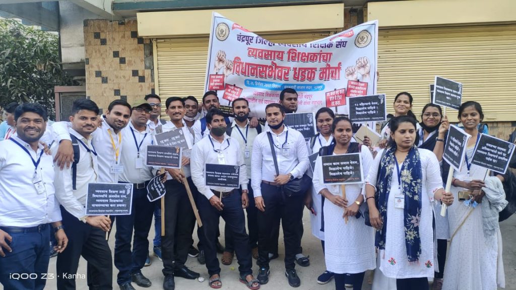 स्वयंरोजगार उपलब्ध करून देणाऱ्या व्यवसाय शिक्षकांच्या न्याय हक्कासाठी राज्यातील हजारो व्यवसाय शिक्षक नागपूर हिवाळी अधिवेशनात लक्षवेधी धडक महामोर्चा काढण्यात आला होता, या महामोर्चामध्ये हजारो व्यवसाय शिक्षकांसह अनेक संघटना व समर्थक उपस्थित होते.राज्यात समग्र शिक्षा अंतर्गत व्यवसाय शिक्षण योजना राबविण्यात येत आहे. सदर योजनेची अंमलबजावणी व सनियंत्रणाची जवाबदारी असलेल्या समग्र कार्यालयामार्फत हि योजना शासनामार्फत पूर्णपणे अंमलबजावणी करावी, लेंड -ए-हँड इंडिया या कंपनीने डेटा चोरी करून विविध संस्थाना सादर करून अवैध मार्गाने करोडो रुपये सी एस आर फंड मिळवला याची एस आय टी मार्फत चौकशी करावी या प्रमुख मागणीसह राज्याबाहेरच्या विविध खाजगी कंपन्या व त्रयस्थ संस्था यांची नफेखोरी थांबावी व समग्र शिक्षा विभागात होत असलेला भ्रष्टाचार थांबवावा या मागण्यासाठी नागपूर विधानभवनावर चंद्रपूर जिल्हा व्यवसाय शिक्षक महासंघ यांच्या वतीने भव्य एल्गार पुकारण्यात आला होता, व्यवसाय शिक्षक विधानभवन परिसरातचं तीव्र उन्हामध्ये रस्त्यावर तब्बल ६ तास ठिय्या मांडून बसले होते, आंदोलनादरम्यान व्यवसाय शिक्षकांची एकमुखी मागणी असल्याने दीपक केसरकर यांनी तात्काळ २५ टक्के मानधन वाढीसह समग्र शिक्षा मधील टेंडर घोटाळा, व्यवसाय शिक्षकांचे नियमित वेतन, महिला व्यवसाय शिक्षिकांना प्रसूती रजा, बालसंगोपन रजा आदि मागण्याचे निवेदन स्वीकारून त्यावर योग्य तो निर्णय घेऊ असे आश्वासित केले. विद्यार्थ्यांच्या कौशल्याभिमुख व्यवसाय शिक्षणाचा दर्जा व गुणवत्ता सुधारण्यासाठी आपण प्रयत्न करणार असल्याचे सुद्धा जाहीर केले. खाजगी कंपन्या व त्रयस्थ संस्था यांच्या समग्र शिक्षा मधील अधिकाऱ्याशी असलेले लागेबांधे व आर्थिक हितसंबध याचीही चौकशी करणार असल्याचे त्यांनी म्हटले. समग्र शिक्षा कार्यालयाच्या बाजारीकरण धोरणामुळे राज्यात शासकीय शाळेत माध्यमिक वर्गाना व्यवसाय शिक्षण देणाऱ्या शिक्षकांना अनेक अडचणीचा सामना करावा लागतोय, समग्र शिक्षा मधील भ्रष्ट अधिकाऱ्यांनी टेंडर काढून जे निकृष्ट साहित्य खरेदी केले त्याची एक चौकशी समिती नेमून दोषींवर कार्यवाही करणार असल्याचे दीपक केसरकरानी म्हटले. या वेळी राज्यातील हजारो शिक्षकांसह राज्याचे व्यवसाय शिक्षक संघटनेचे अध्यक्ष शोभराज खोंडे, विभागीय सहसचिव प्रफुल मूने ,चंद्रपूर जिल्ह्याचे जिल्हाध्यक्ष आशिष राजनहिरे, सचिव राहुल सातपुते, कोषाध्यक्ष मयूर कश्यप, महिला संघटक मोनाली पाचघरे, गोविंद बंस्पाल, प्रतीक घोनमोडे, दिपाली चव्हाण, विनोद कामटकर, फिरोज शेमस्कर, शलाखा मेश्राम, रुपेश बुट्टे, संध्या गज्जल्वार, अश्विनी येवले, सपन खर्तड