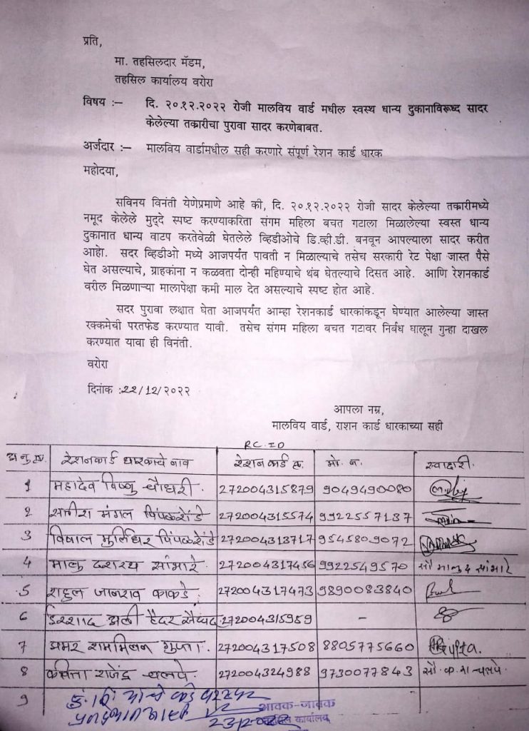 वरोरा शहरातील मालवीय वॉर्ड येथील स्वस्त धान्य दुकान संगम महिला बचत गट यांना 2017 पासून चालविण्यासाठी परवाना देण्यात आला आहे. परंतु स्वस्त धान्य दुकान बचत गटातील कुठलीही सदस्य चालवत नसून मालवीय वॉर्ड येथील देवडे नामक व्यक्ती मार्फत चालवीत आहे.शासनाने ठरवून दिलेल्या दरापेक्षा जास्त दर आकारून धान्य विक्री केली जात असल्याचा आरोप स्थानिक नागरिकांनी केला आहे.तसेच ग्राहकांना रेशन ची पावती दिली जात नाही , एकाच वेळेस दोन महिन्याचे थंब लावून धान्याची उचल करणे ,रात्री उशिरापर्यंत लाईन मध्ये उभे राहणे यासारख्या समस्यांनी नागरिक त्रस्त झाले आहेत.या सर्व समस्यांना घेत नागरिकांनी तहसील कार्यालय वरोरा येथे 20 डिसेंबर 2022 प्रभागातील नागरिकांनी तहसीलदार यांना निवेदन दिले असता फूड इन्सपेक्टर चौधरी यांनी 23 डिसेंबर रोजी लेखी जबाब नोंदविण्यात आले.स्वस्त धान्य दुकान ग्राहकांनी देवडे व संगम महिला बचत गट यांच्या विरोधात पुराव्यानिशी तक्रार केली त्यानुसार संगम महिला बचत गटावर प्रतिबंध लादून नवीन बचत गटाला स्वस्त धान्य दुकान चालविण्यासाठी देण्याची मागणी प्रभागातील नागरिकानी केली.