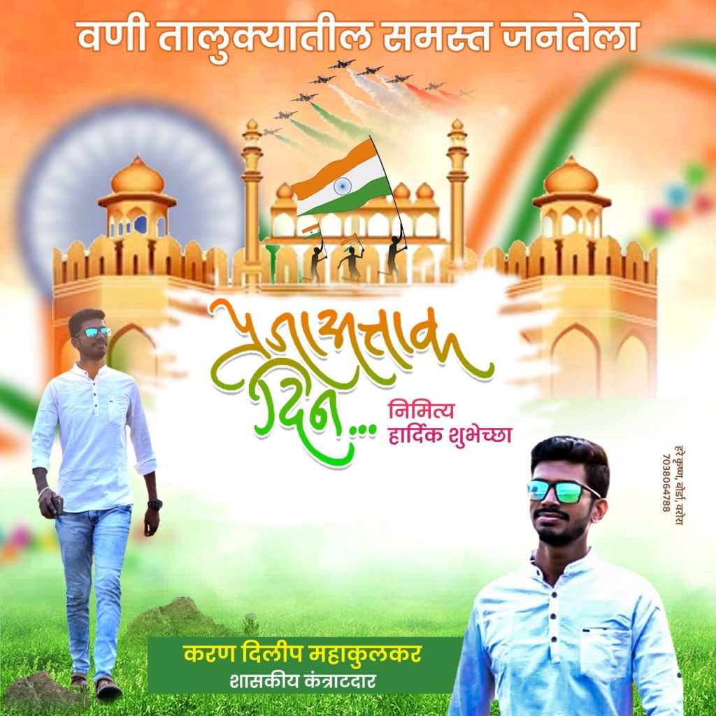 वणी तालुक्यातील समस्त जनतेला प्रजासत्ताक दिनाच्या हार्दिक शुभेच्छा:करण दिलीपराव महाकुलकर Post author:lkhtpt Post published:January 25, 2023 Post category:Uncategorized इतरांना पाठवा Share this content Opens in a new window Opens in a new window Opens in a new window You Might Also Like स्व. मोहित झोटिंग यांच्या स्मृतीदिना निमित्त वडकी येथे भव्य रोग निदान व रक्तदान शिबिर आयोजन August 11, 2021 महातोली येथे श्री भुराजी महाराज यांचे 41व्या पुण्यतिथी निमित्ताने धार्मिक उत्सवाचे आयोजन April 8, 2023 पूजा कावळे हत्त्या कांड , पतीचं निघाला खुनाचा सूत्रधार November 21, 2021