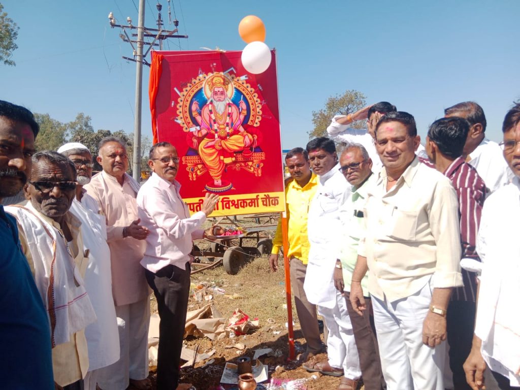 दिनांक ३ फेब्रुवारी शुक्रवारला एका स्थानिक चौकाला प्रजापती श्री विश्वकर्मा असे नामकरन करण्यात आले तत्पूर्वी कला व कौशल्या चे आराध्य दैवत प्रजापती श्री विश्वकर्मा यांच्या प्रतिमेला पुष्पहार अर्पण करून तदनंतर उपस्थित असलेल्या मान्यवरांनी विधिवत पूजन करून आदरयुक्त नमस्कार अर्पण केला तसे बघता ज्यावेळी कोणतीही कला कौशल्य या बाबीची जडणघडण किंवा जन्मा घालावयाची असल्यास श्री प्रजापती विश्वकर्मा यांचे स्मरण करूनच पुढील कार्य सिद्दीस नेल्या जाते तसेच अनेक पौराणिक कथेमध्ये सुद्धा प्रजापती श्री विश्वकर्मा यांच्या कलेचा उत्कृष्ट व सुबक अशा कलाकृतींचे पितामह म्हणून ओळखल्या जातात त्यामुळे या दिलेल्या चौकाला श्री विश्वकर्मा यांचे नाव दिल्यामुळे योग्य तो न्याय या परिसराला मिळाला असे अनेक उपस्थित असलेल्या मान्यवरांनी आपले मनोगत व्यक्त करताना यावेळी सांगितले विशेष म्हणजे माता भगिनींनी सूबक व उत्कृष्ट स्थापत्य असलेल्या रांगोळ्या काढून वातावरण अधिकच भक्तिमय व मंगलमय बनवले होते या कार्यक्रमाला शहरातील अनेक प्रतिष्ठित व ज्येष्ठ नागरिक उपस्थित होते त्यामध्ये शहराचे नगराध्यक्ष सुरेशजी जयस्वाल, उपनगराध्यक्ष शेख जहीर, विष्णुदासजी वर्मा, बाळासाहेब चंद्रे, आनंदराव चंद्रे, रमेश गायकवाड, नितीन ठाकूर, शिवाजी वैद्य, व गेल्या अनेक वर्षांपासून प्रजापती श्री विश्वकर्मा यांना आराध्य मानून आपल्या कला व कौशल्याने अख्या पंचकोशीत प्रसिद्ध असलेले गंगाराम सूर्यवंशी सुद्धा उपस्थित होते व अनेक मान्यवरांची उपस्थिती होती.